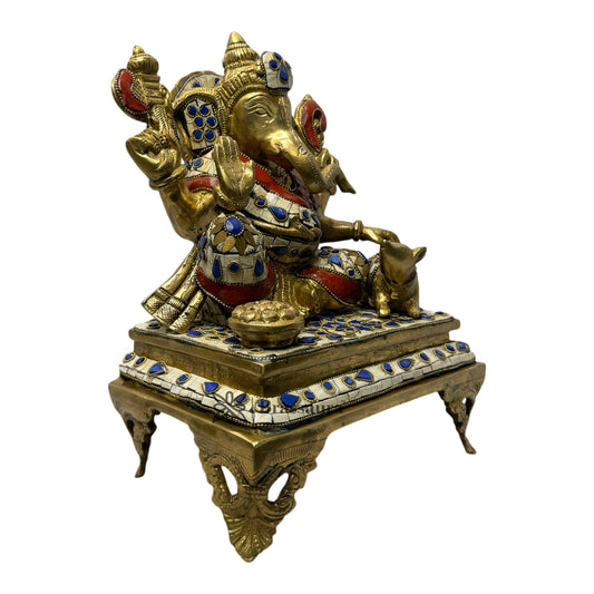Brassaura™ Brass Gem Stone Work Ganesha with Mouse Idol – Height 8.3 inches & Weight 3.85 kgs | Ganpati Murti for Pooja & Home Décor