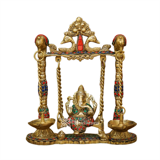 Brassaura™ Brass Gem Stone Work Ganesha Jhula Idol for Home and Decor | Weight 2.1 Kgs | Height 9 Inches