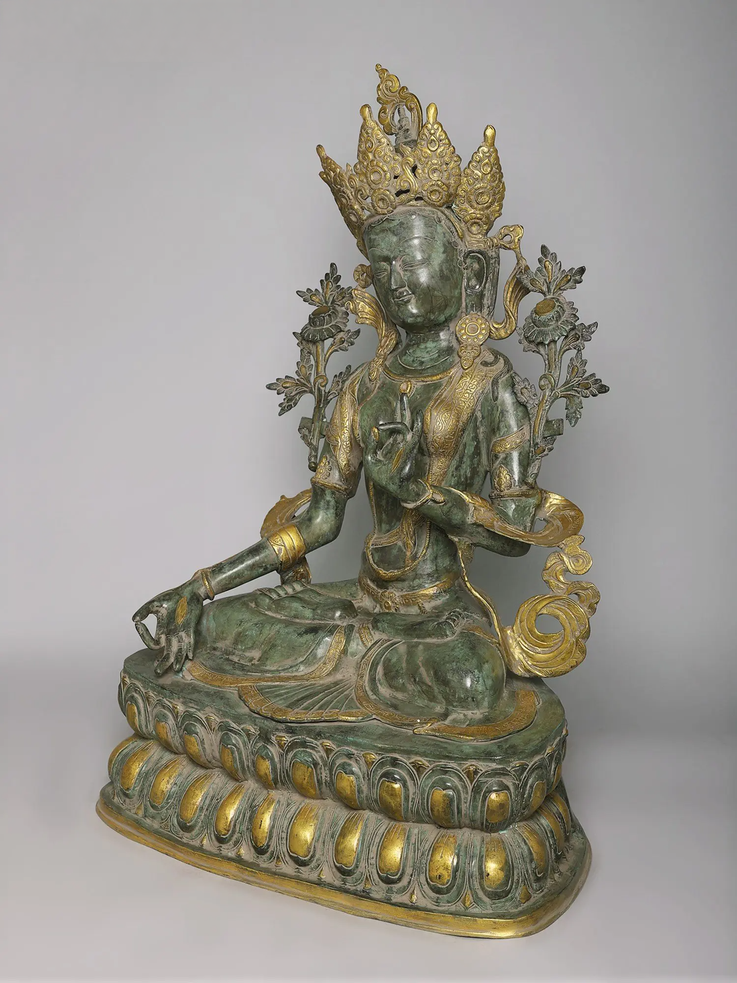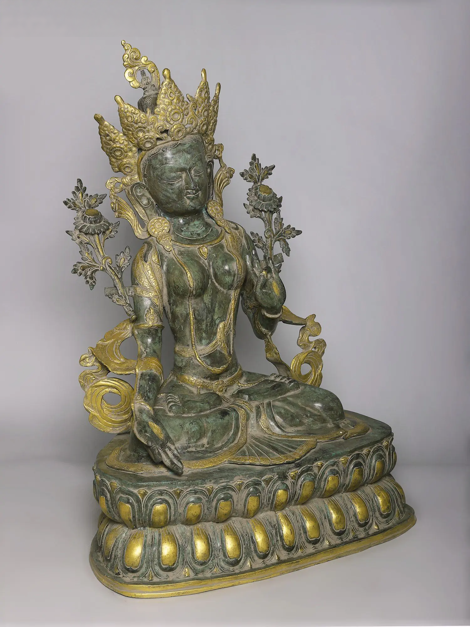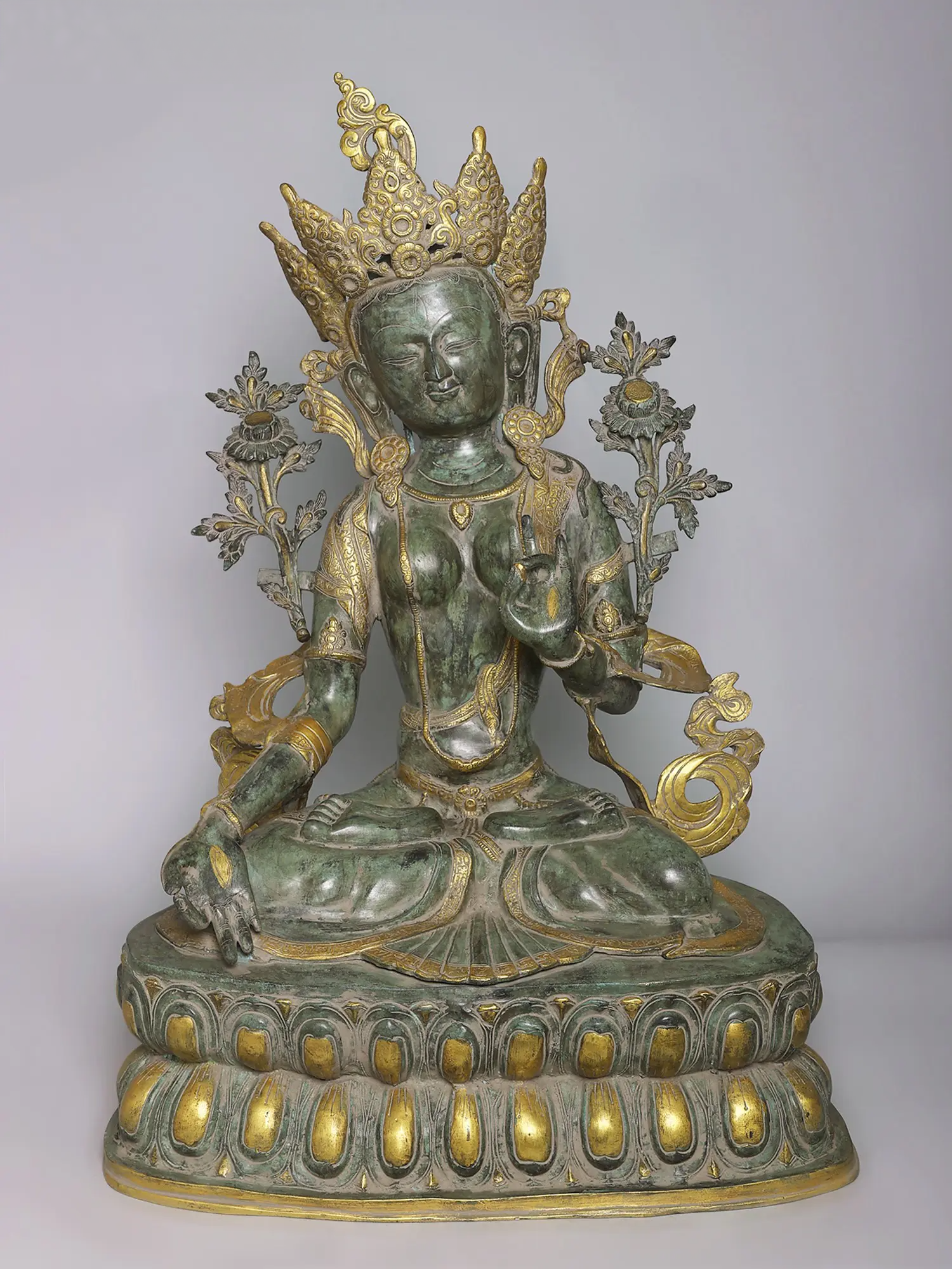 ध्यान मुद्रा में शालीनता से विराजमान यह शानदार तारा देवी की मूर्ति शांति और आध्यात्मिक शक्ति का विकिरण करती है। जटिल नक्काशी, अलंकृत मुकुट के काम और कंधों के पीछे से उभरते फूलों के रूपांकनों के साथ तैयार की गई, दोहरे रंग की प्राचीन फिनिश इसकी दिव्य उपस्थिति को बढ़ाती है, जिससे यह मंदिरों और परिष्कृत अंदरूनी हिस्सों के लिए एक आकर्षक केंद्रबिंदु बन जाती है।