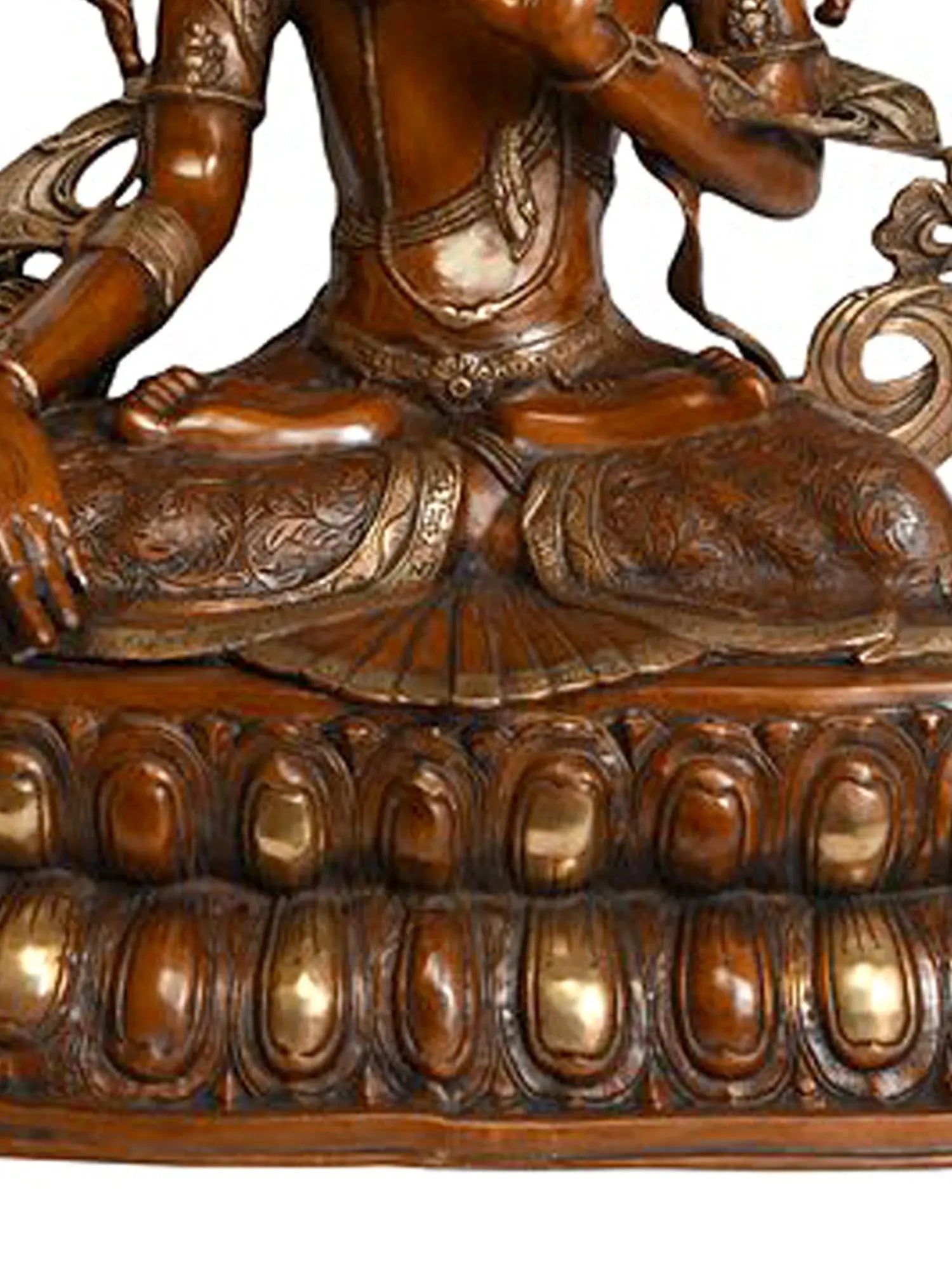 ध्यान मुद्रा में शालीनता से विराजमान यह शानदार तारा देवी प्रतिमा शांति और आध्यात्मिक शक्ति का संचार करती है। जटिल नक्काशी, अलंकृत मुकुट कार्य और कंधों के पीछे उगने वाले फूलों के रूपांकनों से निर्मित, दोहरे रंग की प्राचीन फिनिश इसकी दिव्य उपस्थिति को बढ़ाती है, जिससे यह मंदिरों और परिष्कृत आंतरिक सज्जा के लिए एक आकर्षक केंद्र बिंदु बन जाती है।
