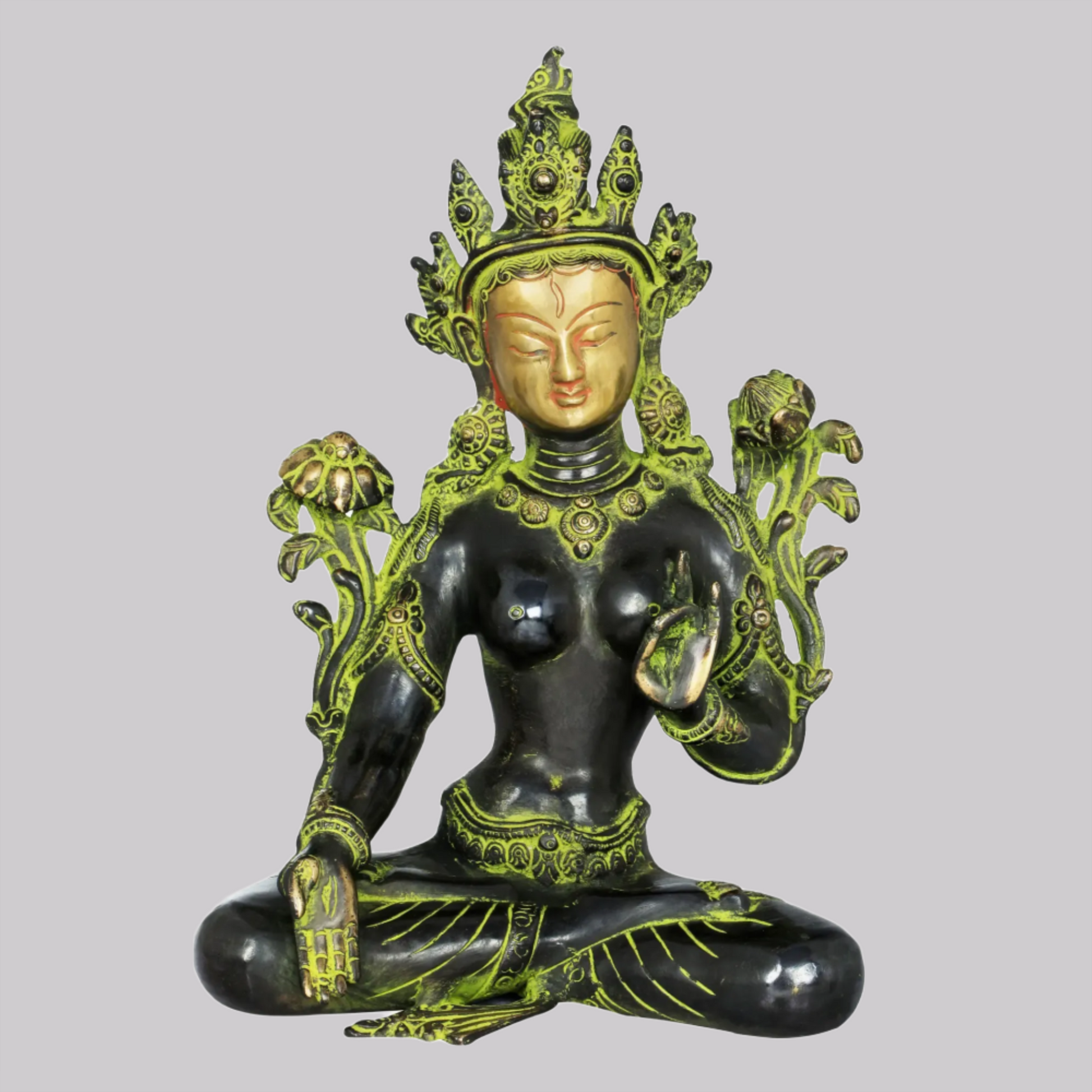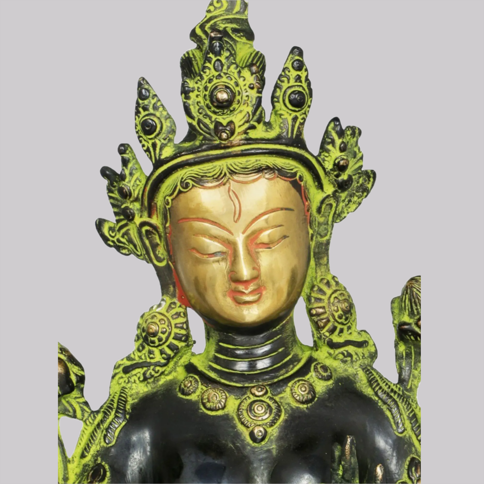 उत्कृष्ट अलंकरणों, शांत मुख मुद्रा और पारंपरिक कमल के आधार के साथ विस्तृत रूप से सजी यह मूर्ति बेहतरीन भारतीय शिल्प कौशल और भक्ति कला को दर्शाती है। एंटीक गोल्ड फ़िनिश इसकी आध्यात्मिक आभा को बढ़ाता है, जिससे यह ध्यान स्थान, बौद्ध वेदी, योग स्टूडियो और शांत घर की सजावट के लिए आदर्श बन जाती है।