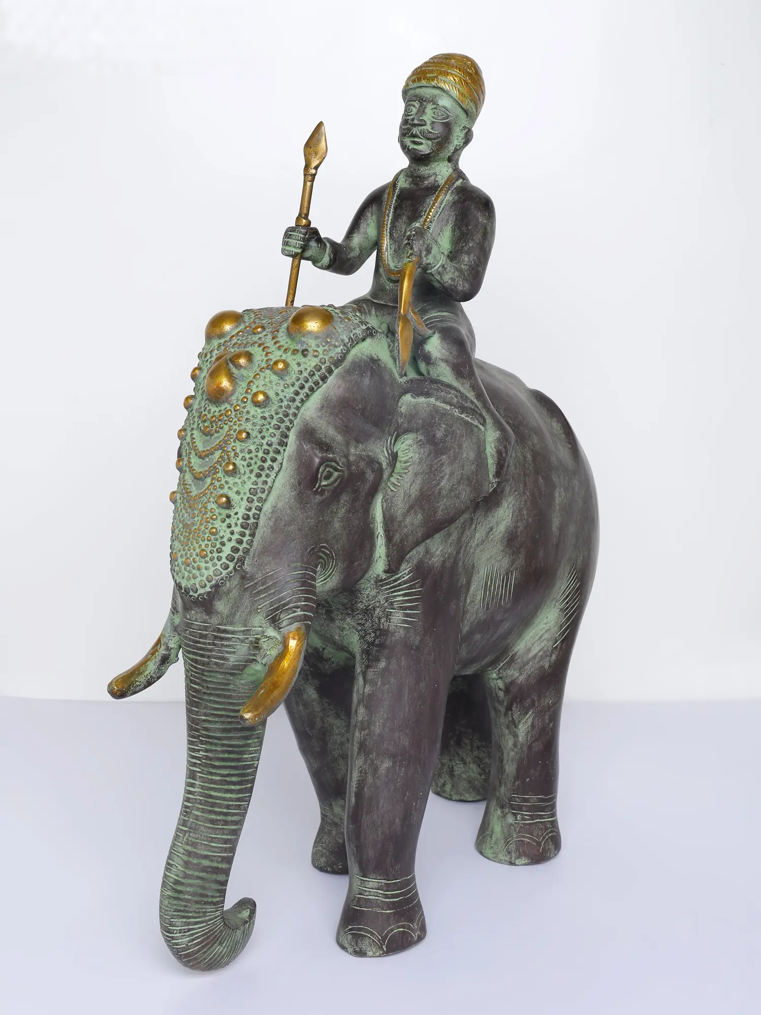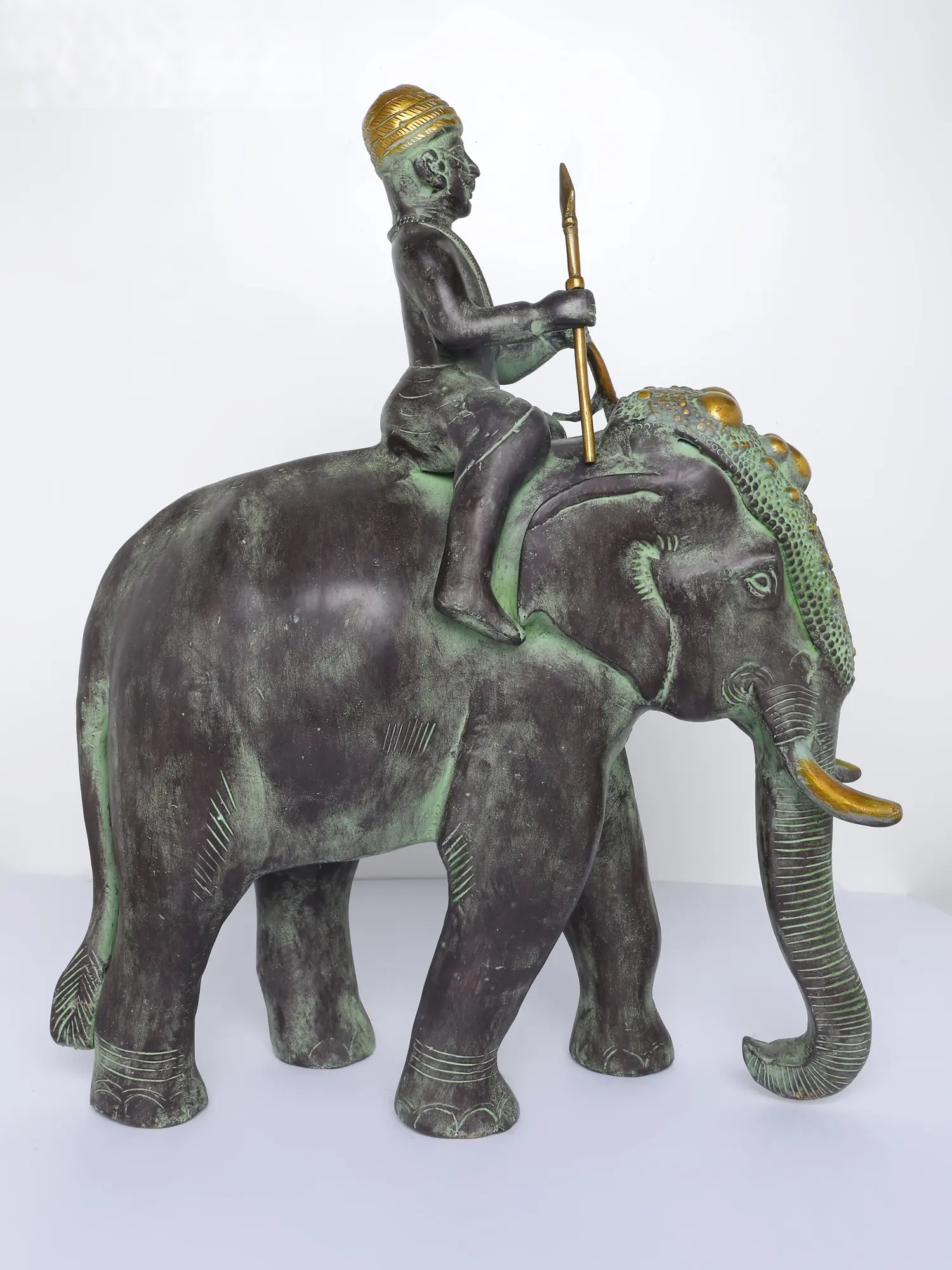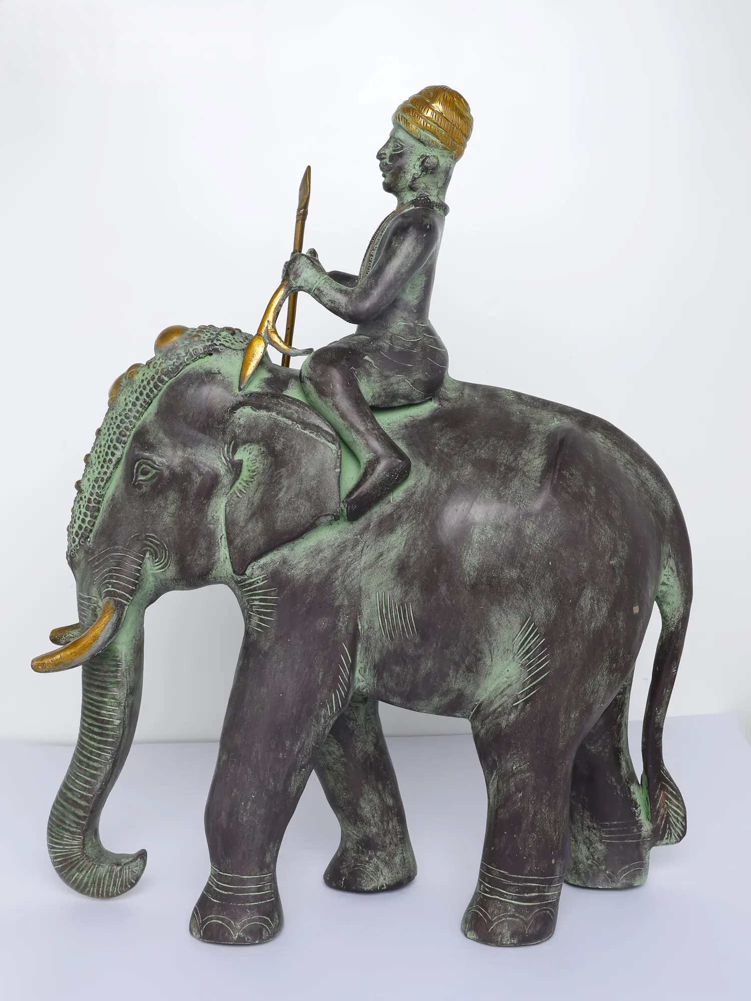 एक हाथी पर शान से सवार एक आदिवासी योद्धा का कलात्मक चित्रण, यह हस्तनिर्मित पीतल की मूर्ति देहाती विवरण और एक प्राचीन हरे रंग के पैटिना फ़िनिश को प्रदर्शित करती है। जटिल नक्काशी, पारंपरिक शिरोवस्त्र और सुव्यवस्थित भाला विरासत शिल्प कौशल को दर्शाते हैं, जिससे यह शानदार अंदरूनी हिस्सों और क्यूरेटेड सजावट वाले स्थानों के लिए एक आकर्षक कलाकृति बन जाती है।