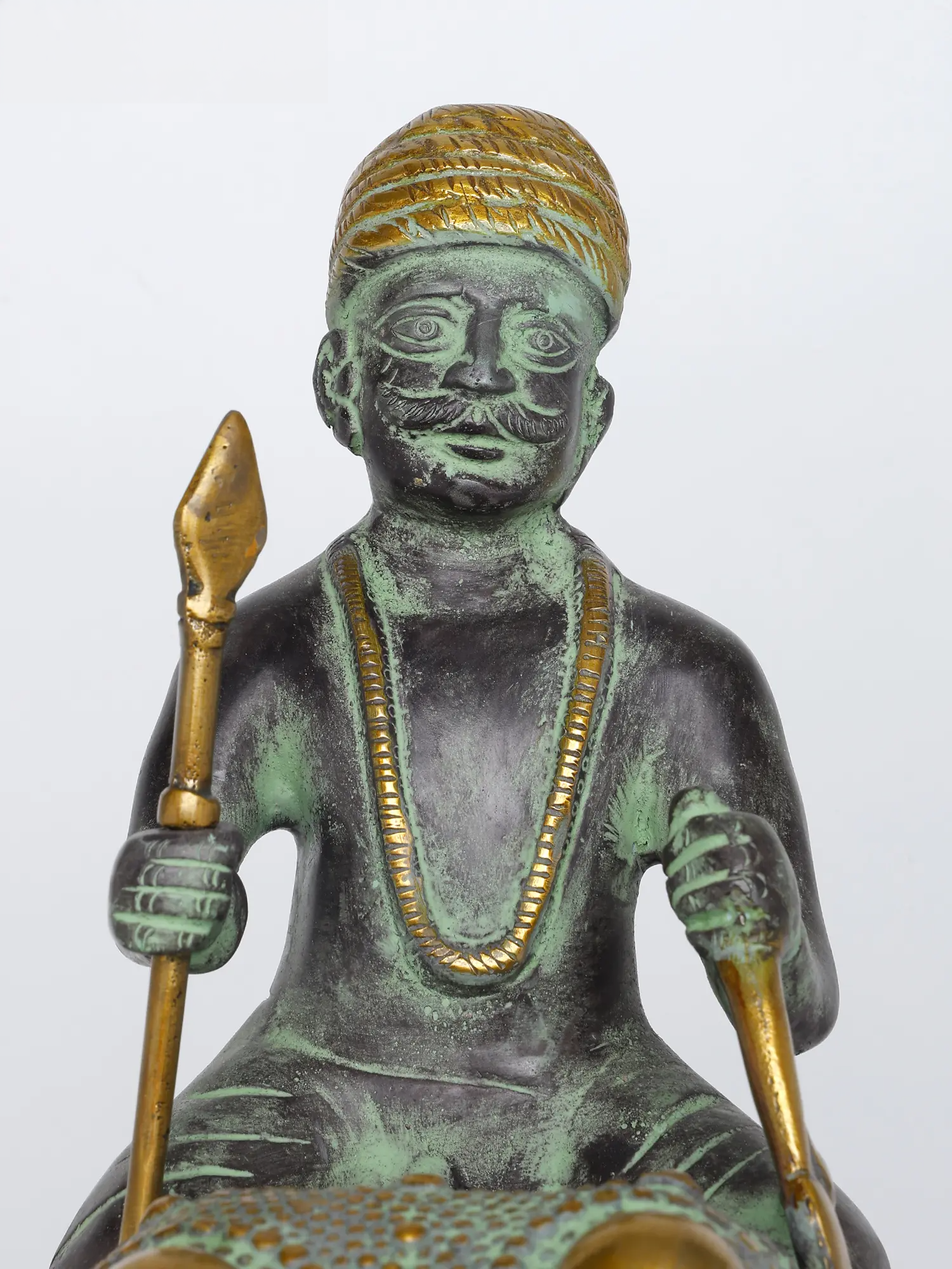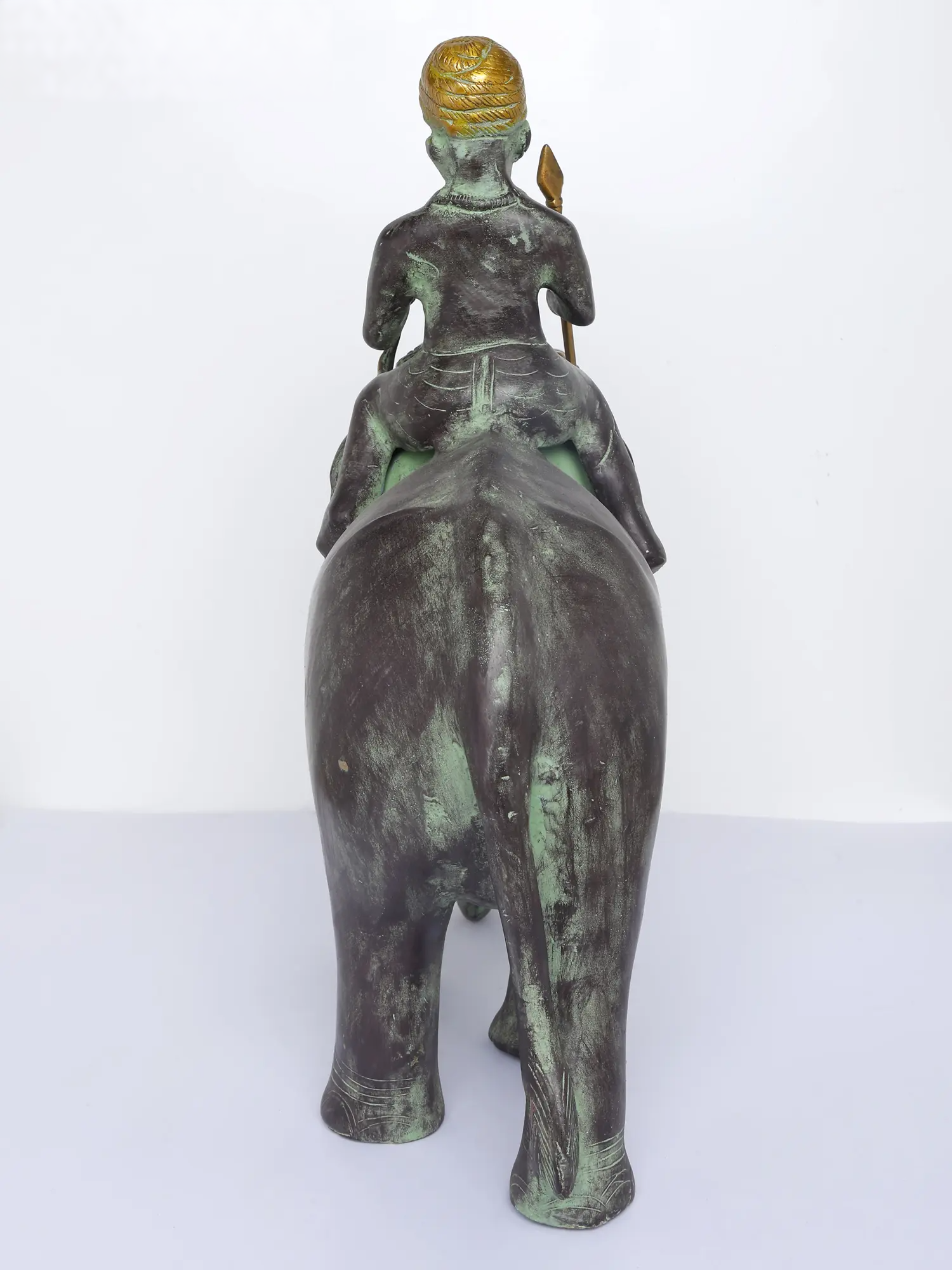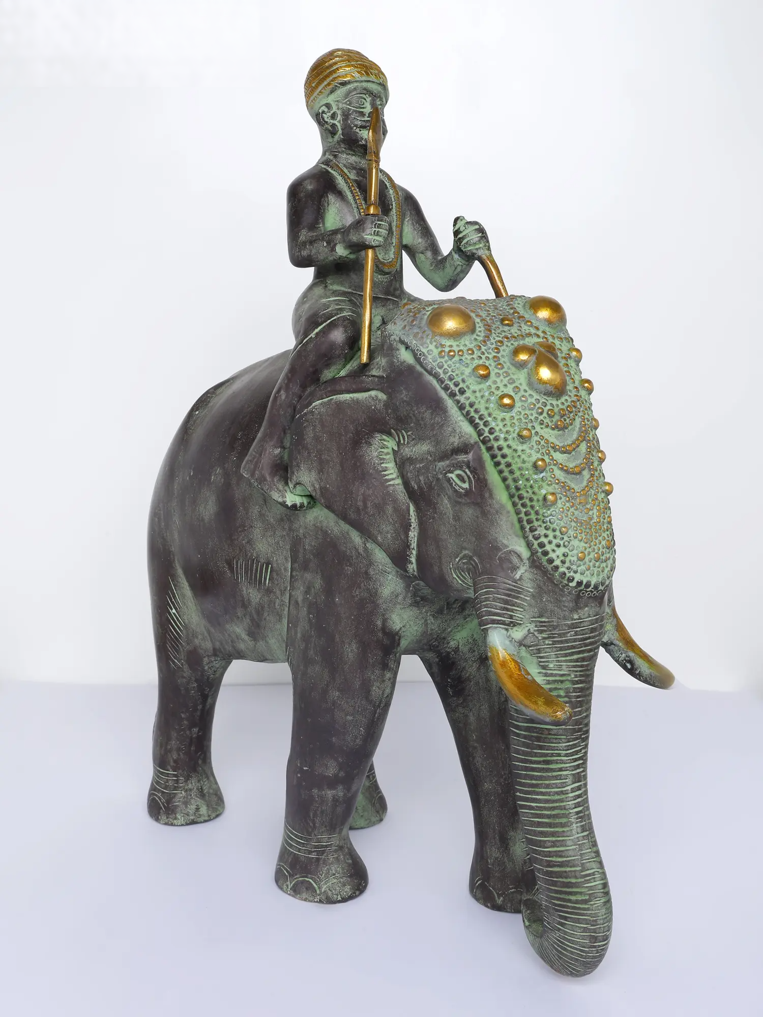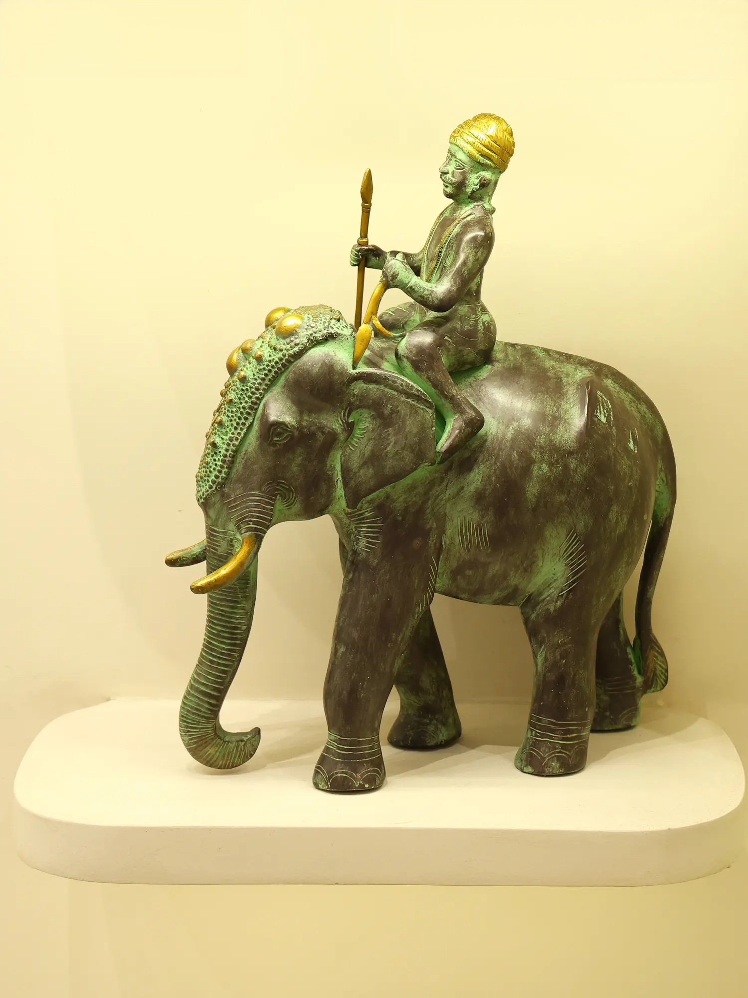 एक हाथी पर शान से सवार एक आदिवासी योद्धा का कलात्मक चित्रण, यह हस्तनिर्मित पीतल की मूर्ति देहाती विवरण और एक प्राचीन हरे रंग के पैटिना फ़िनिश को प्रदर्शित करती है। जटिल नक्काशी, पारंपरिक शिरोवस्त्र और सुव्यवस्थित भाला विरासत शिल्प कौशल को दर्शाते हैं, जिससे यह शानदार अंदरूनी हिस्सों और क्यूरेटेड सजावट वाले स्थानों के लिए एक आकर्षक कलाकृति बन जाती है।