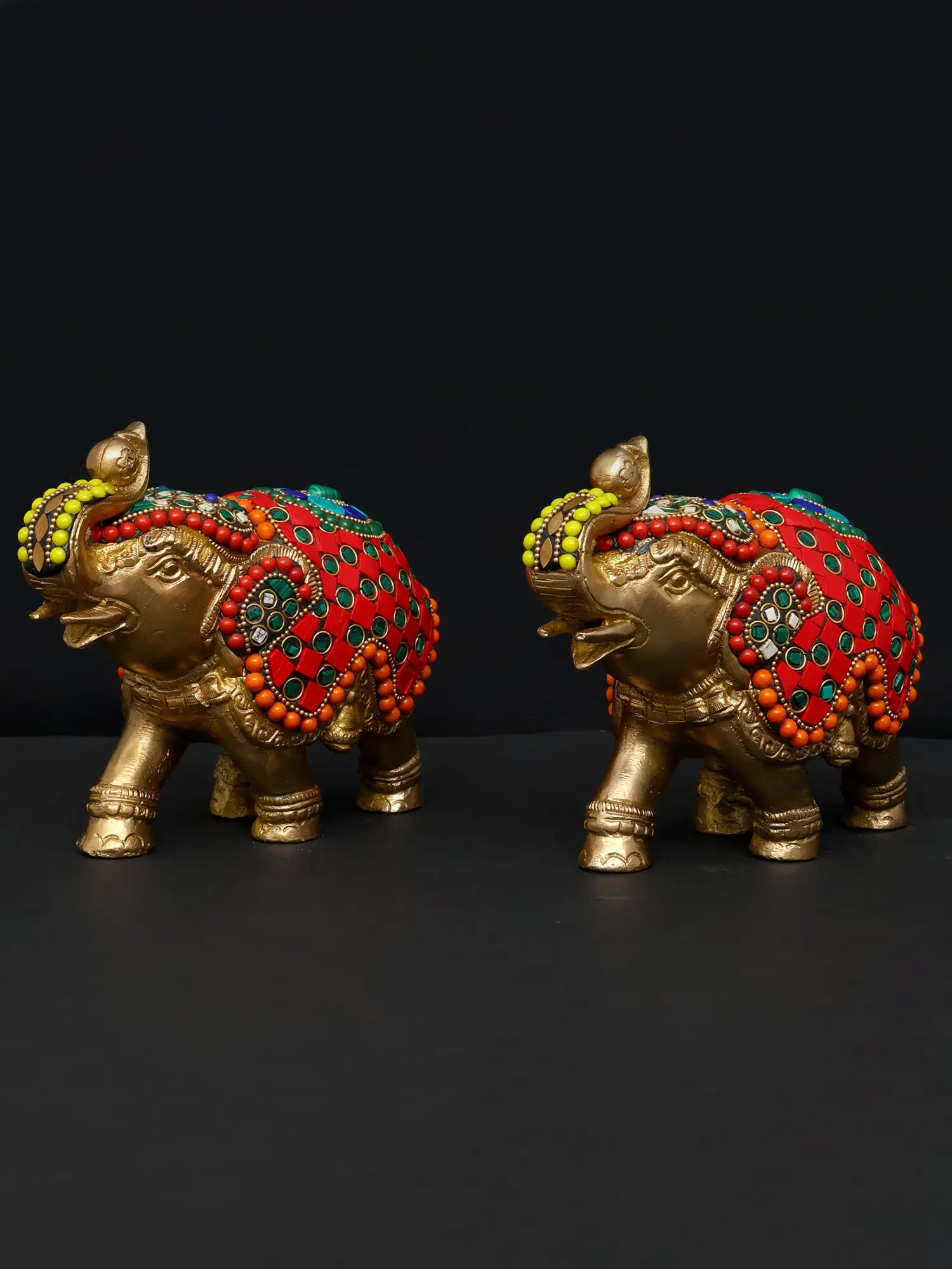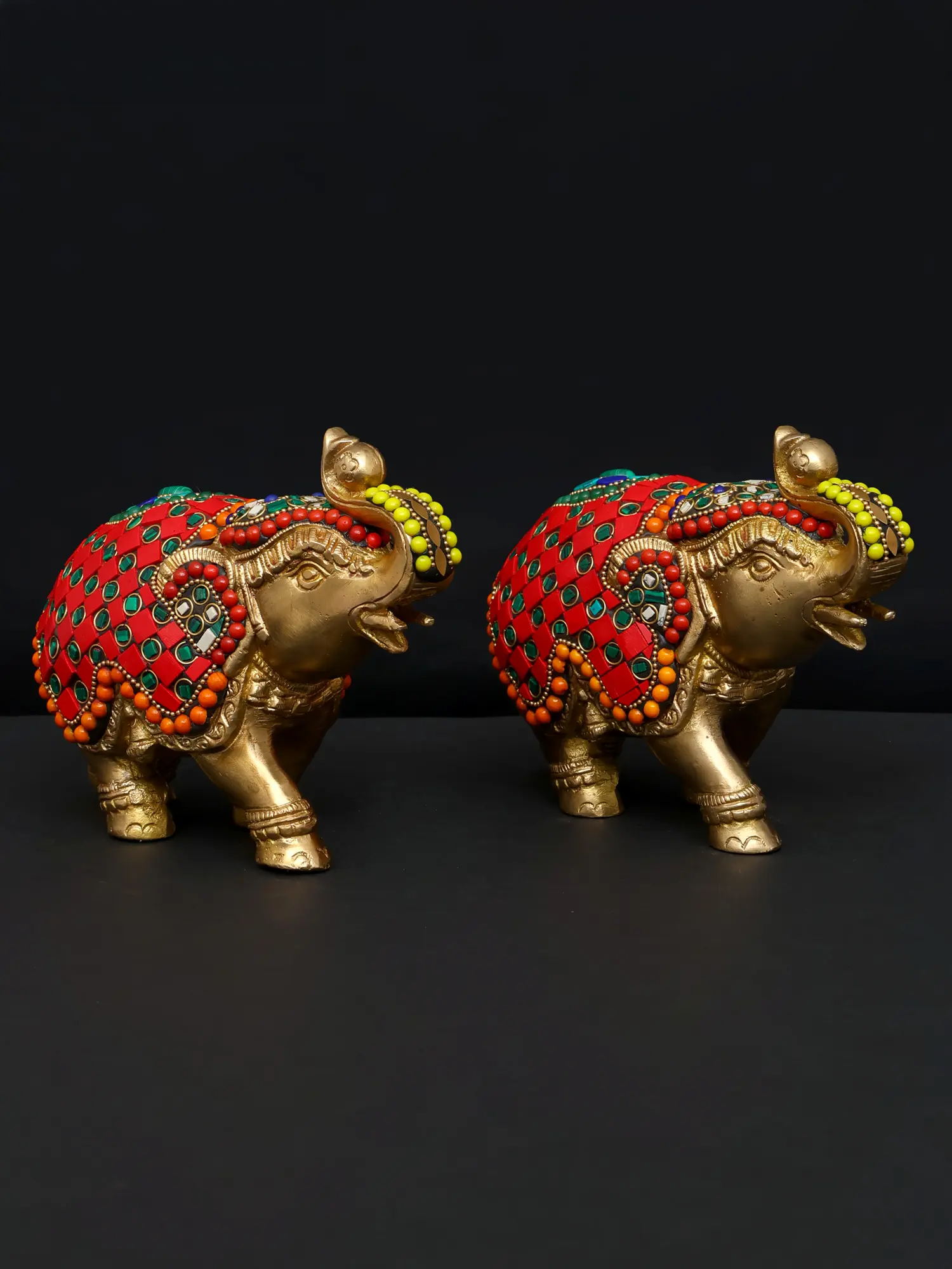 ब्रासौर® मल्टीकलर इनले वर्क के साथ हाथी की पीतल की मूर्तियों का जोड़ा | शुद्ध पीतल | ऊंचाई 5.5 इंच और वजन 3.53 किलोग्राम
