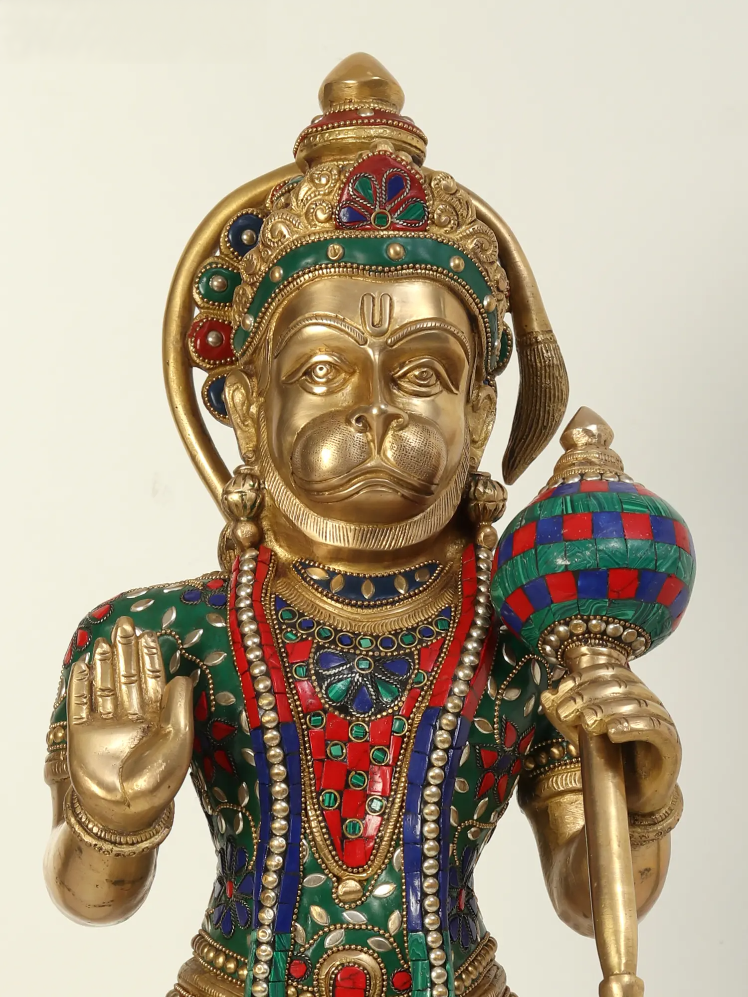 विशेष रूप से हस्तनिर्मित, यह शानदार खड़ी हनुमान प्रतिमा पोशाक और आभूषणों पर जटिल जड़ाऊ कलाकृति के साथ असाधारण विवरण प्रदर्शित करती है। भगवान हनुमान को गदा धारण करते हुए आशीर्वाद की मुद्रा में दर्शाती हुई, यह मूर्ति शक्ति, भक्ति और दिव्य सुरक्षा का प्रतीक है - जो इसे मंदिरों, पूजा कक्षों या भव्य आंतरिक सज्जा के लिए एक शक्तिशाली आध्यात्मिक उपस्थिति बनाती है।