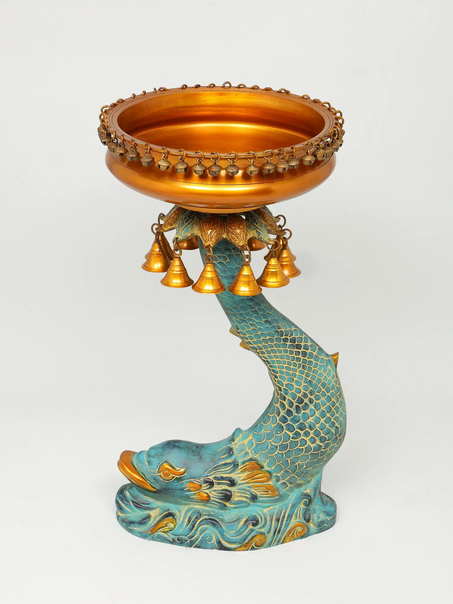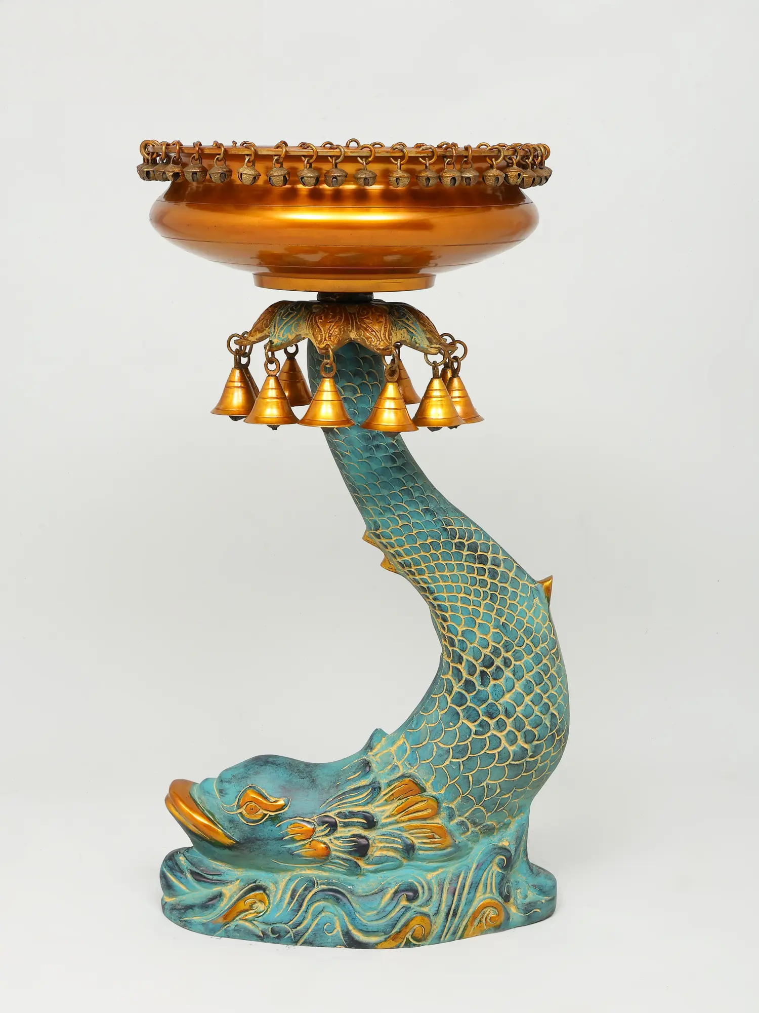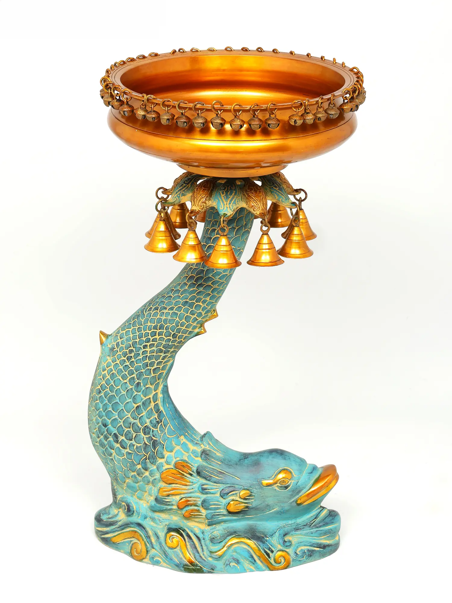 कोई मछली की सुंदर चाल से प्रेरित, यह आकर्षक पीतल का उरली कलात्मक डिज़ाइन को पारंपरिक सजावट के साथ मिश्रित करता है। सुंदर ढंग से गढ़ी गई मछली, स्टाइलिश लहरों से ऊपर उठती है, जो एक सजावटी उरली कटोरे को सहारा देती है, जिसे नाजुक लटकती घंटियों से सजाया गया है जो आकर्षण और मधुर ध्वनि जोड़ते हैं। इसका जीवंत पैटीना और सुरुचिपूर्ण शिल्प कौशल इसे तैरते फूलों, मोमबत्तियों या उत्सव की सजावट के लिए एक आकर्षक केंद्रबिंदु बनाते हैं।