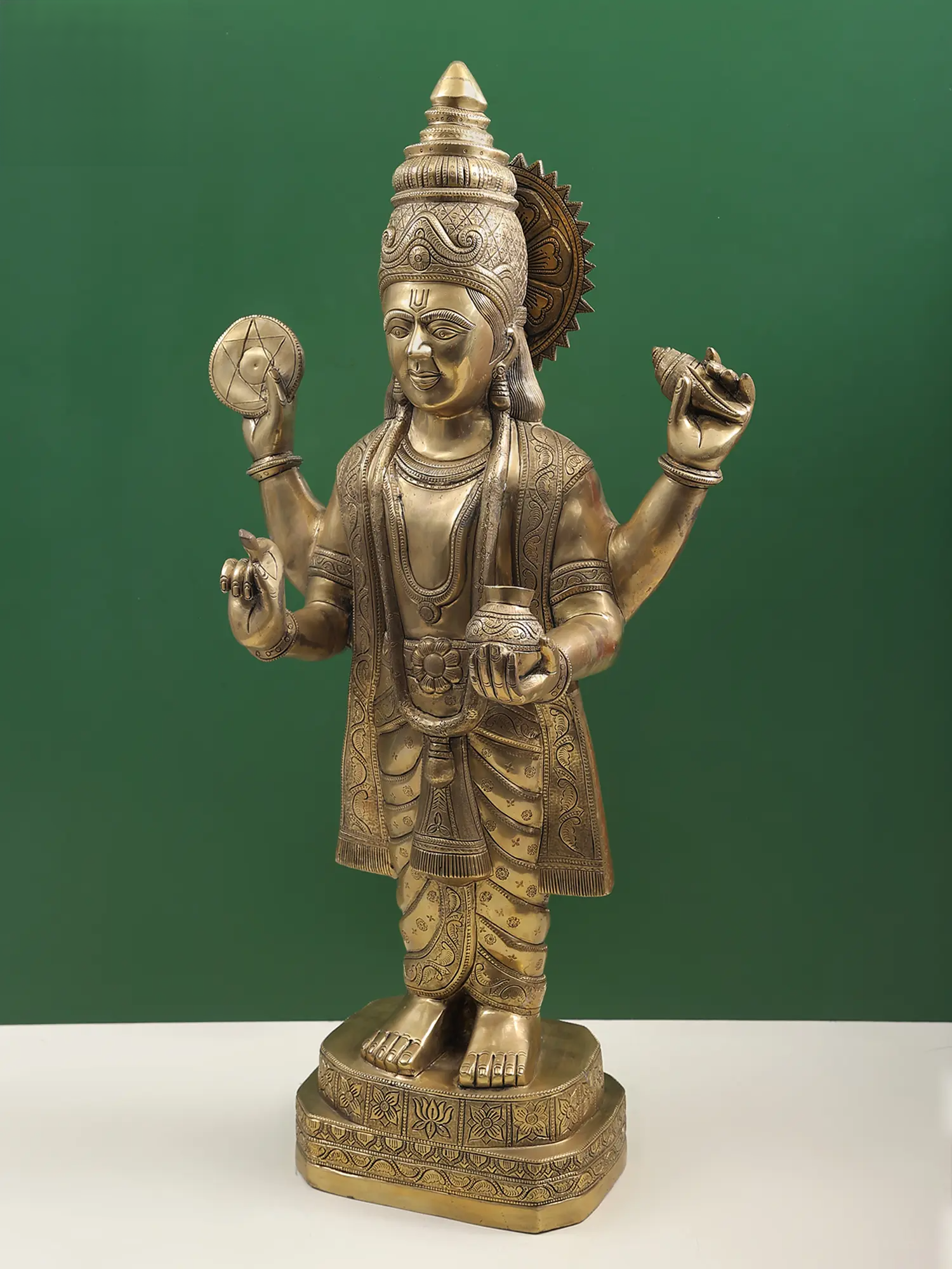 ब्रासौरा® शंख और चक्र के साथ खड़े भगवान विष्णु | शुद्ध पीतल | ऊंचाई 34 इंच और वजन 27.70 किलोग्राम