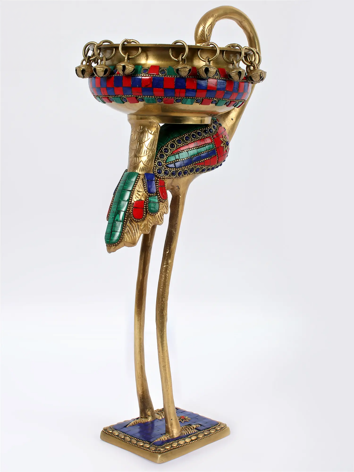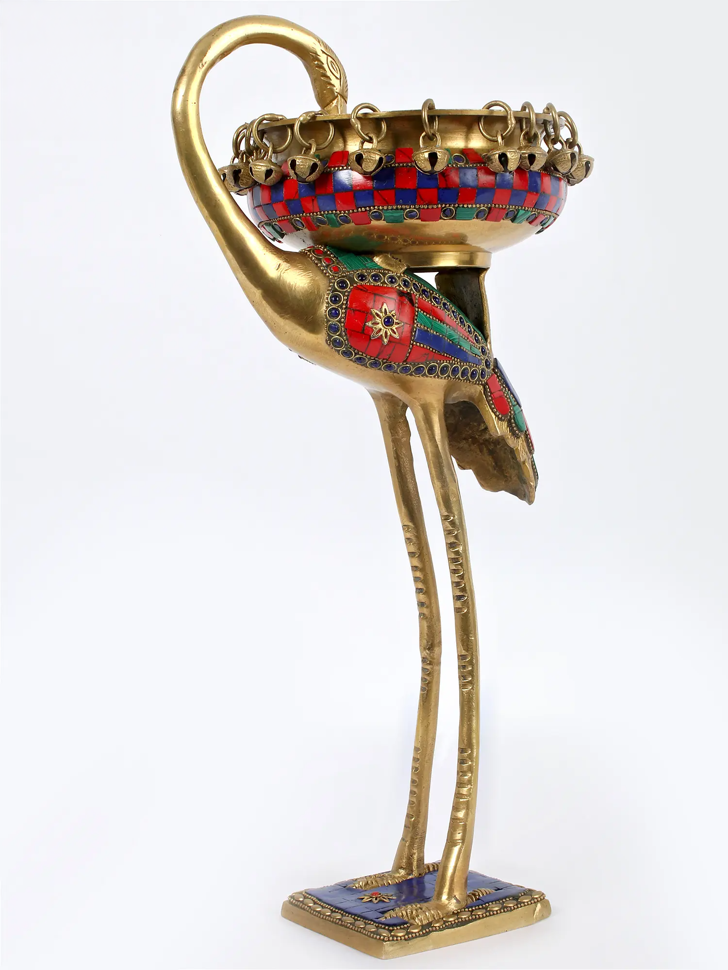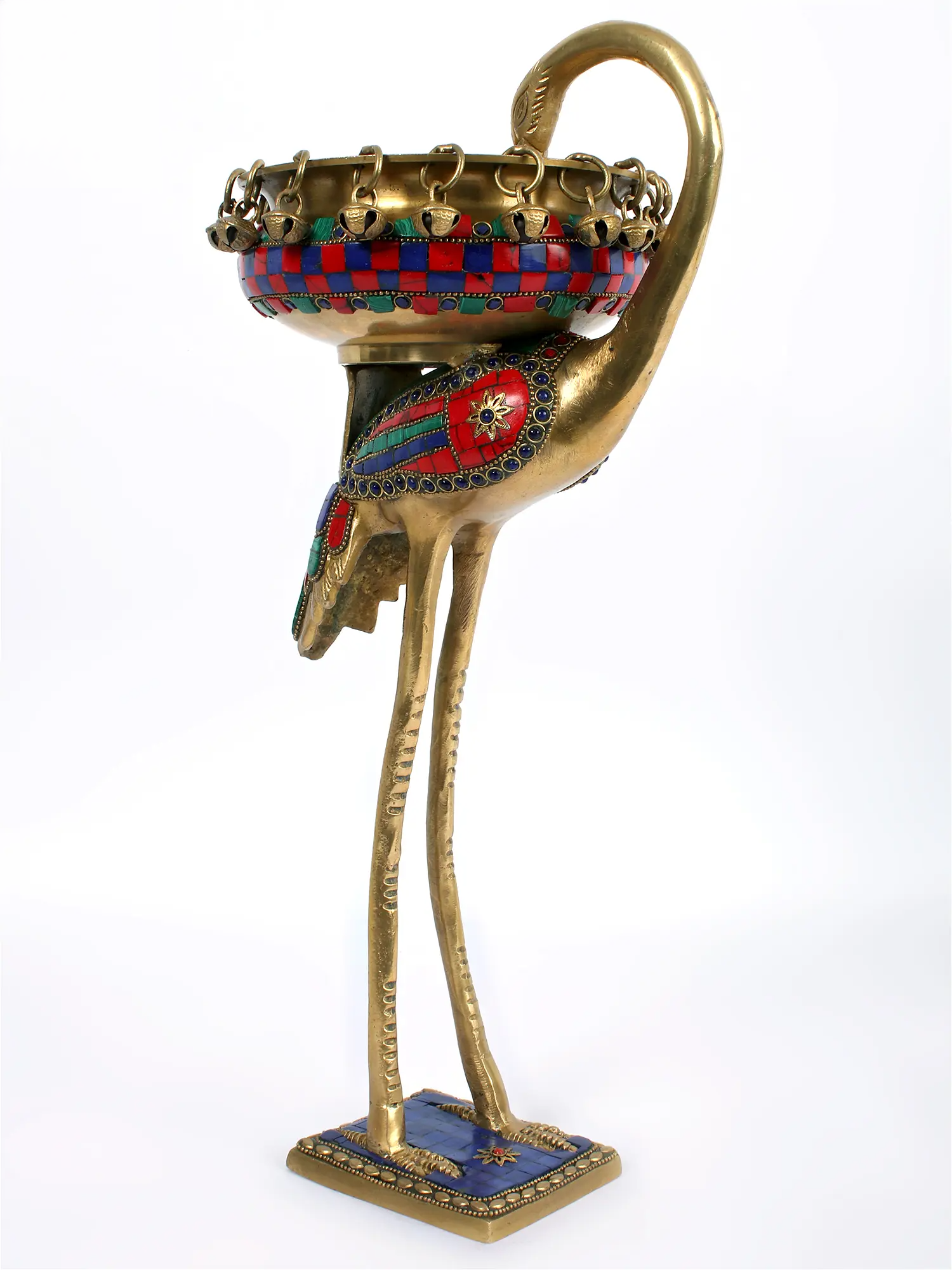 ब्रासौर® फ्लेमिंगो ब्रास उर्ली, मल्टीकलर इनले वर्क और हैंगिंग बेल्स के साथ | शुद्ध पीतल | ऊंचाई 17 इंच और वज़न 2.91 किलोग्राम