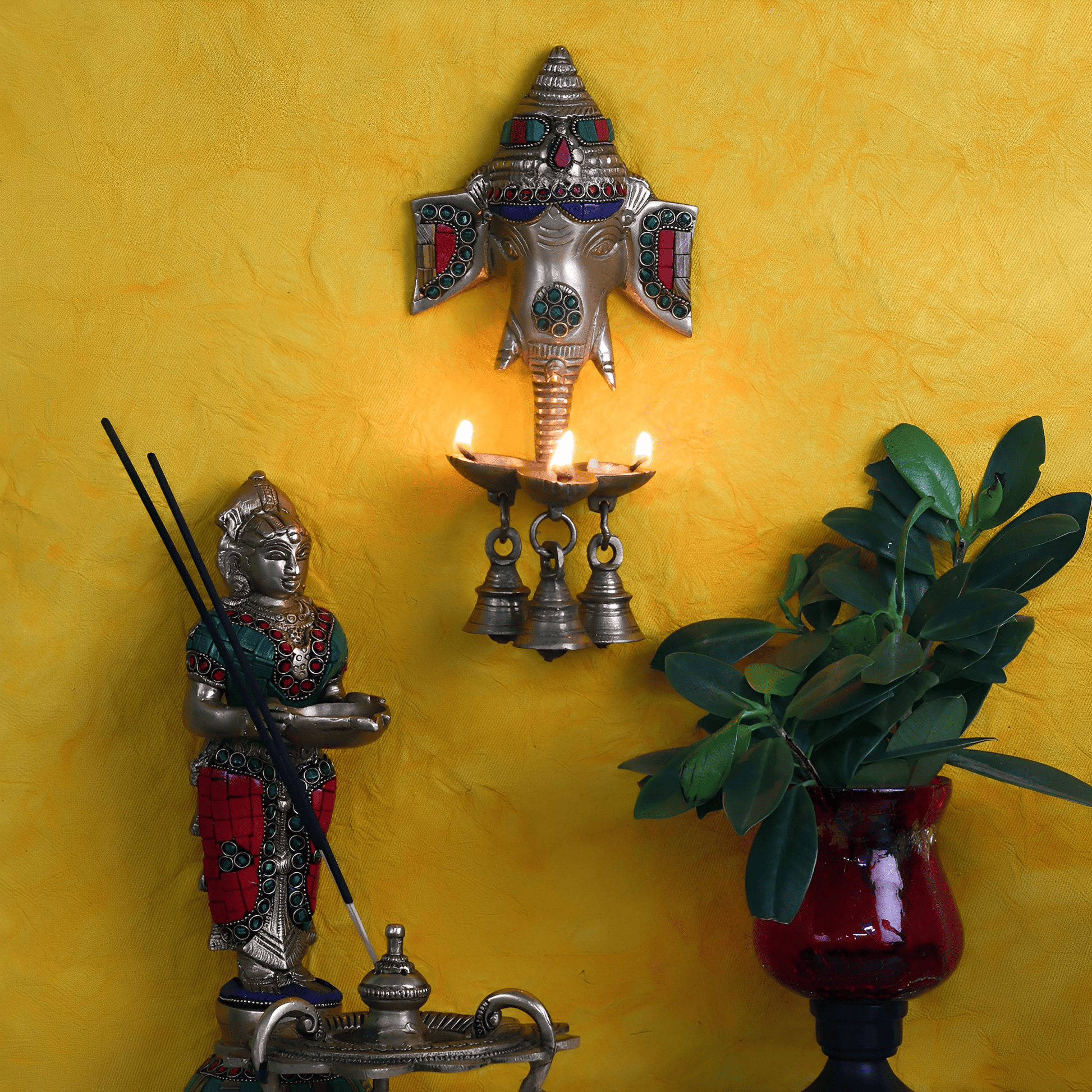 ब्रासौरा® ब्रास गणेश दीया वॉल हैंगिंग लैंप रंगीन पत्थरों के साथ | ऊंचाई 9.5 इंच