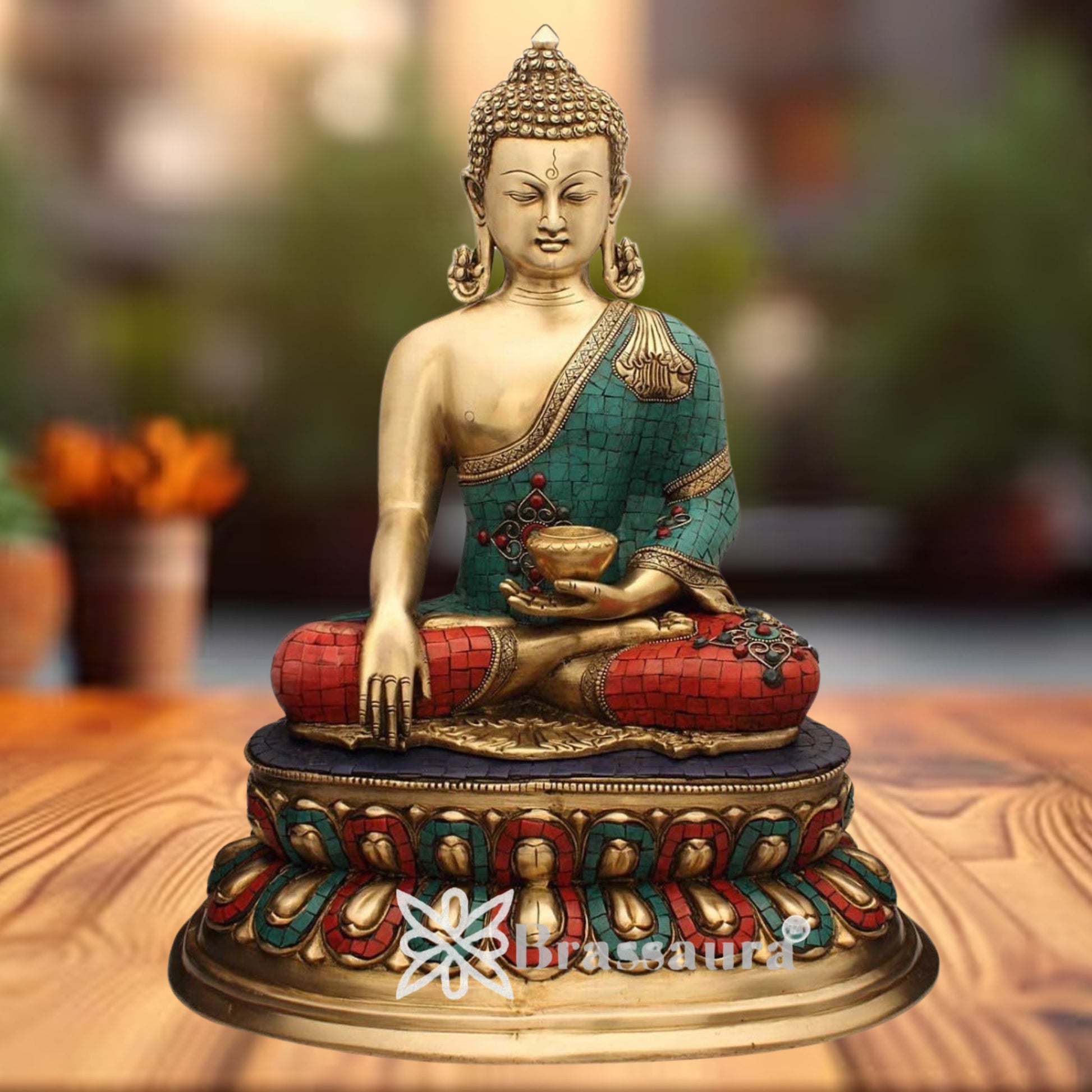 Elevate your space with the spiritual elegance of this Brass Classic Buddha adorned with stunning gemstone inlay work. Standing 22 inches tall and weighing 18 kg, this handcrafted statue is made from solid brass, exuding richness, serenity, and artistic excellence.