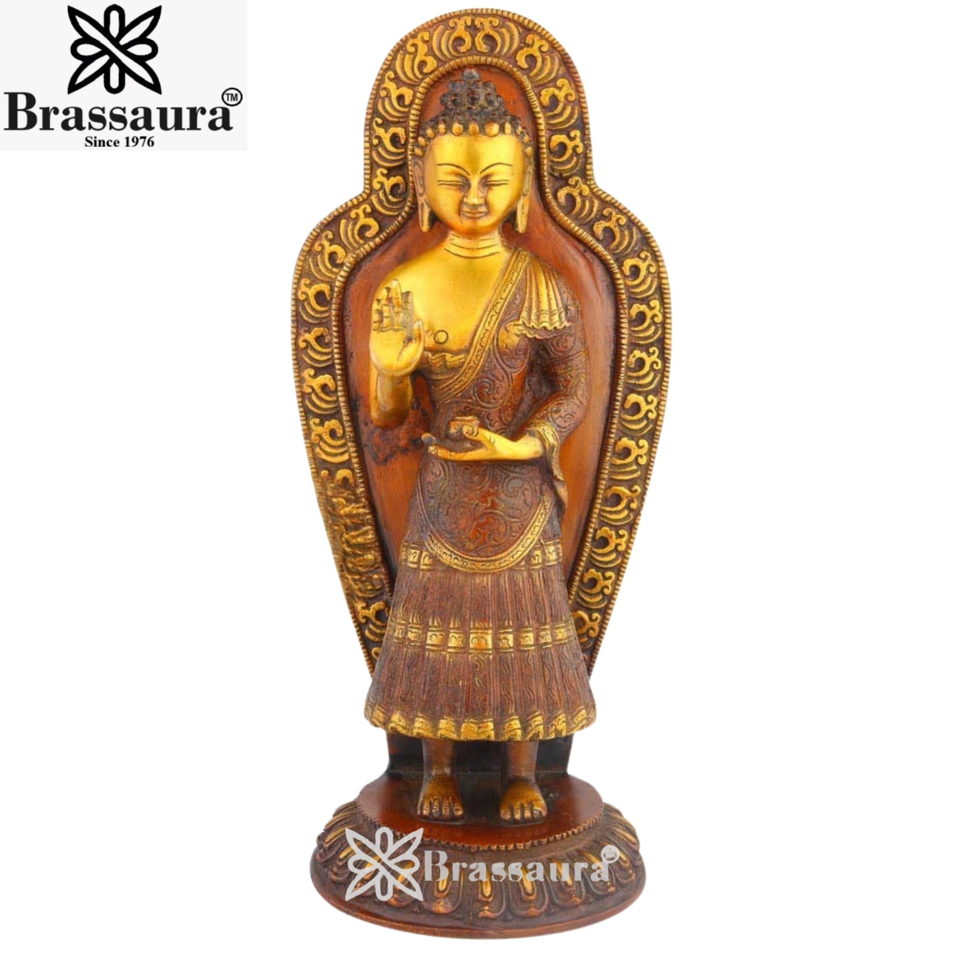 The Buddha is depicted in a graceful standing posture, symbolizing compassion, courage, and enlightenment. The intricate detailing showcases expert craftsmanship, making it a striking centerpiece for home altars, meditation spaces, or sophisticated décor.