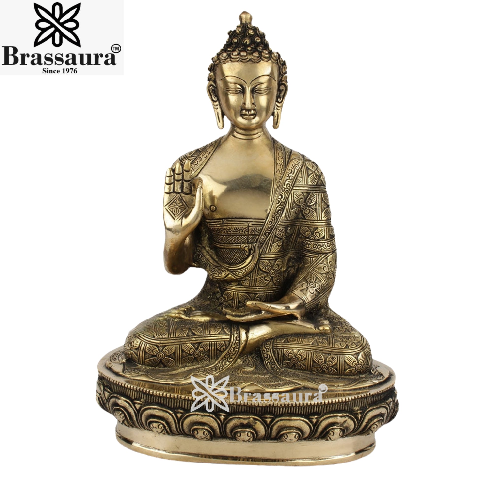 Graceful and empowering, this Brass Blessing Buddha stands 12 Inch tall and weighs 4.9 kg, exuding a serene presence. Crafted from solid brass, the statue features the Buddha in the Abhaya Mudra—the gesture of blessing and fearlessness—symbolizing divine protection, peace, and inner strength.