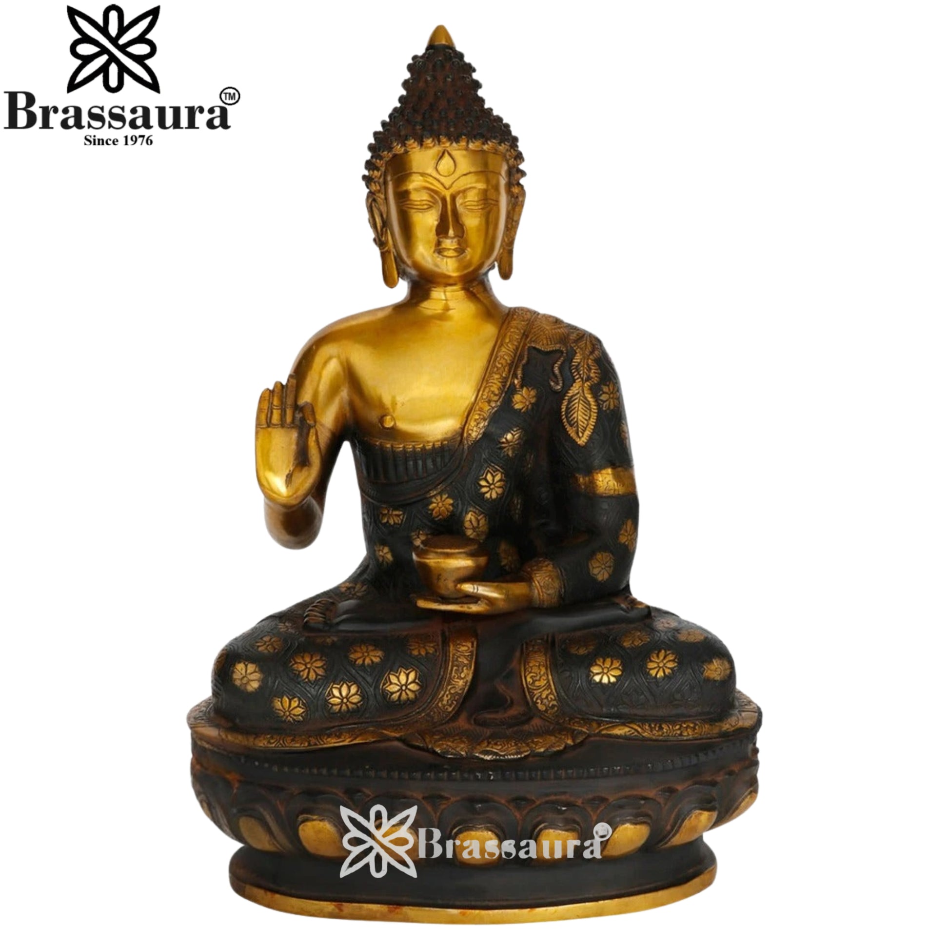 This Brass Blessing Buddha stands 23 Inch tall and weighs 15 kg, crafted from solid brass with a smooth, polished finish. Shown in the Abhaya Mudra—the gesture of blessing and fearlessness—this statue radiates peace, protection, and spiritual reassurance.