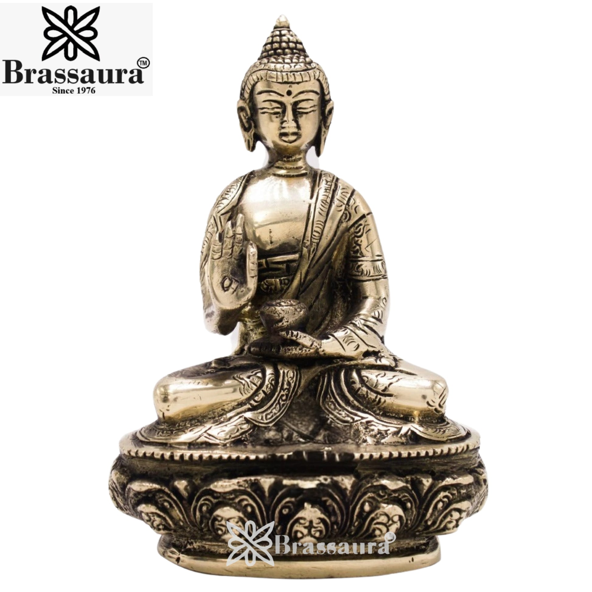 This Brass Blessing Buddha stands 5.5 Inch tall and weighs 0.9 kg. Made from solid brass, it portrays the Buddha in the Abhaya Mudra—the sacred gesture of blessing, protection, and peace.