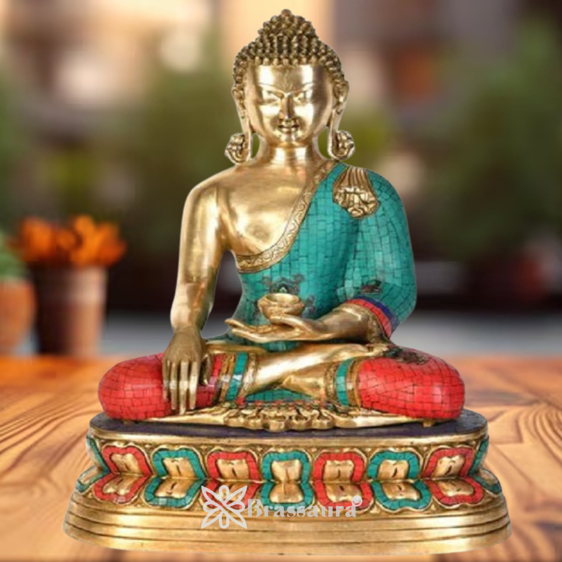 This Brass Bhumisparsa Gem Stone Work Buddha stands 24 Inch tall and weighs 27 kg, skillfully crafted from solid brass and adorned with exquisite multicolored gemstone inlays. The Buddha is shown in the Bhumisparsa Mudra—the earth-touching gesture symbolizing enlightenment and spiritual awakening.