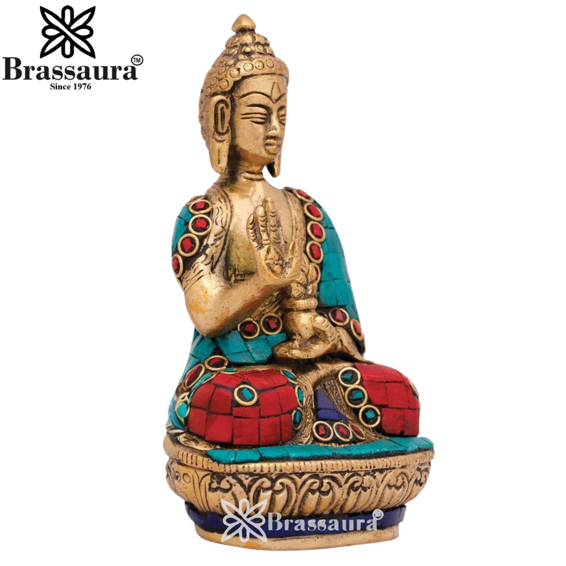 This Brass Blessing Gem Stone Work Buddha stands 5 Inch tall and weighs 0.9 kg, crafted from solid brass with beautiful multicolored gemstone inlay. Featuring the Buddha in the Abhaya Mudra—the gesture of blessing and protection—this piece symbolizes peace, courage, and spiritual strength.
