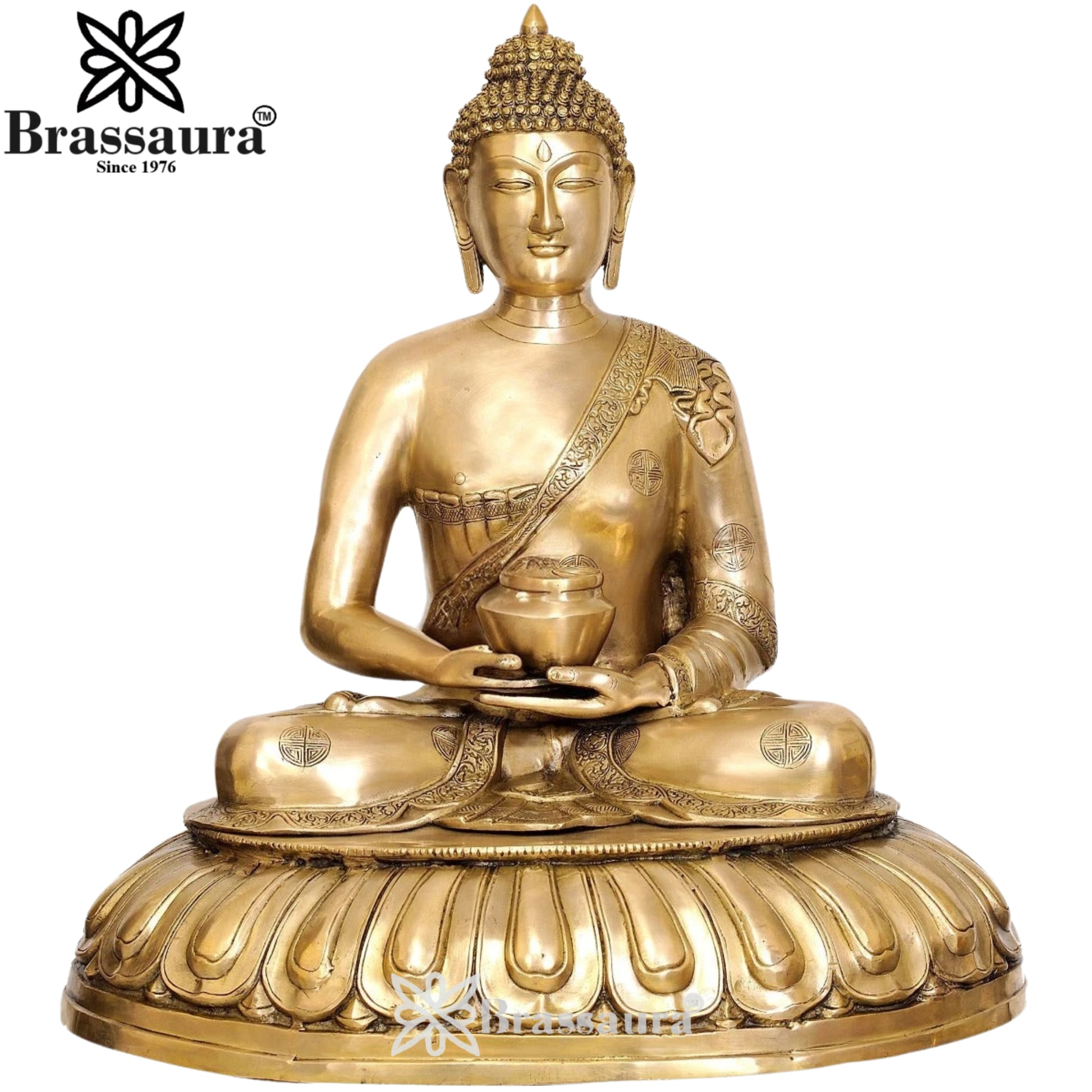 This Brass Blessing Buddha stands 28 Inch tall and weighs 33 kg, masterfully handcrafted from solid brass with exceptional attention to detail. The Buddha is depicted in the Abhaya Mudra—the gesture of blessing and fearlessness—symbolizing divine protection, peace, and spiritual strength.