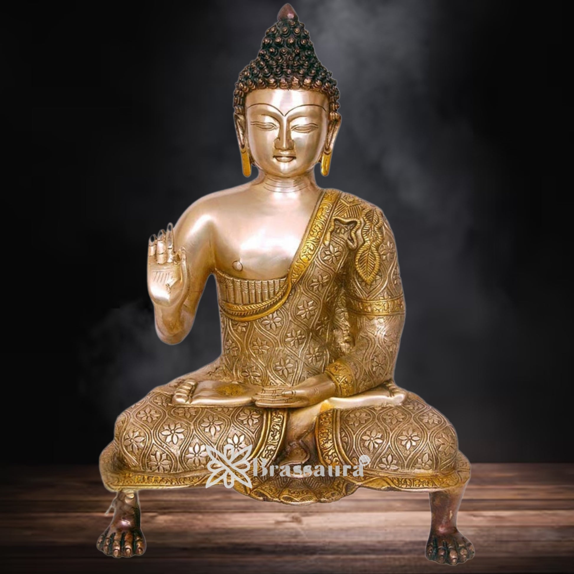 Elegant and commanding, this Brass Blessing Buddha stands 20 Inch tall and weighs 11 kg. Crafted from solid brass, it depicts the Buddha in the Abhaya Mudra—the gesture of blessing, protection, and fearlessness—symbolizing peace and spiritual strength.