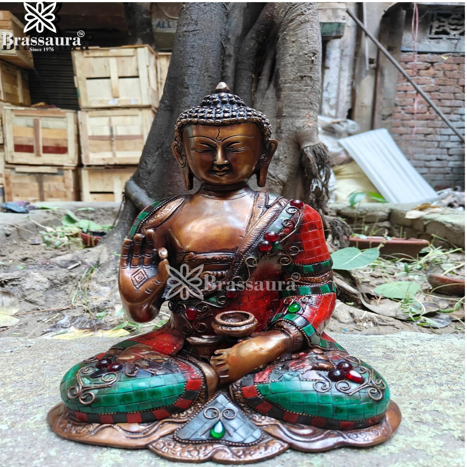 This Brass Blessing Gem Stone Work Buddha stands 11.5 Inch tall and weighs 5.3 kg, meticulously crafted from solid brass with detailed multicolored gemstone inlay. Depicted in the Abhaya Mudra—the gesture of blessing and fearlessness—this statue symbolizes peace, protection, and spiritual strength.