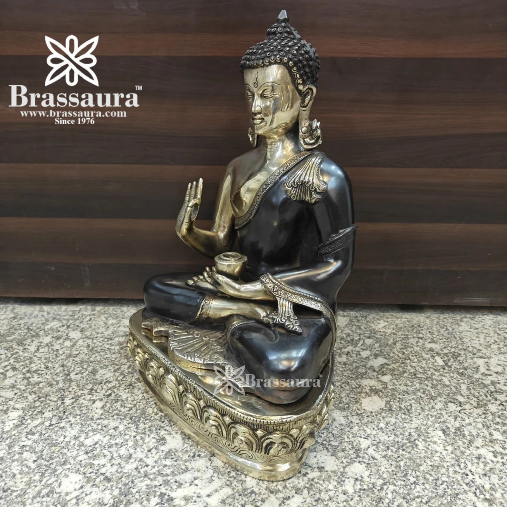 Magnificent and spiritually uplifting, this Brass Blessing Multicolored Buddha stands 20 Inch tall and weighs 16 kg, beautifully handcrafted from solid brass and adorned with vibrant multicolored detailing. The Buddha is depicted in the Abhaya Mudra—the gesture of blessing and fearlessness—offering protection, peace, and divine reassurance.