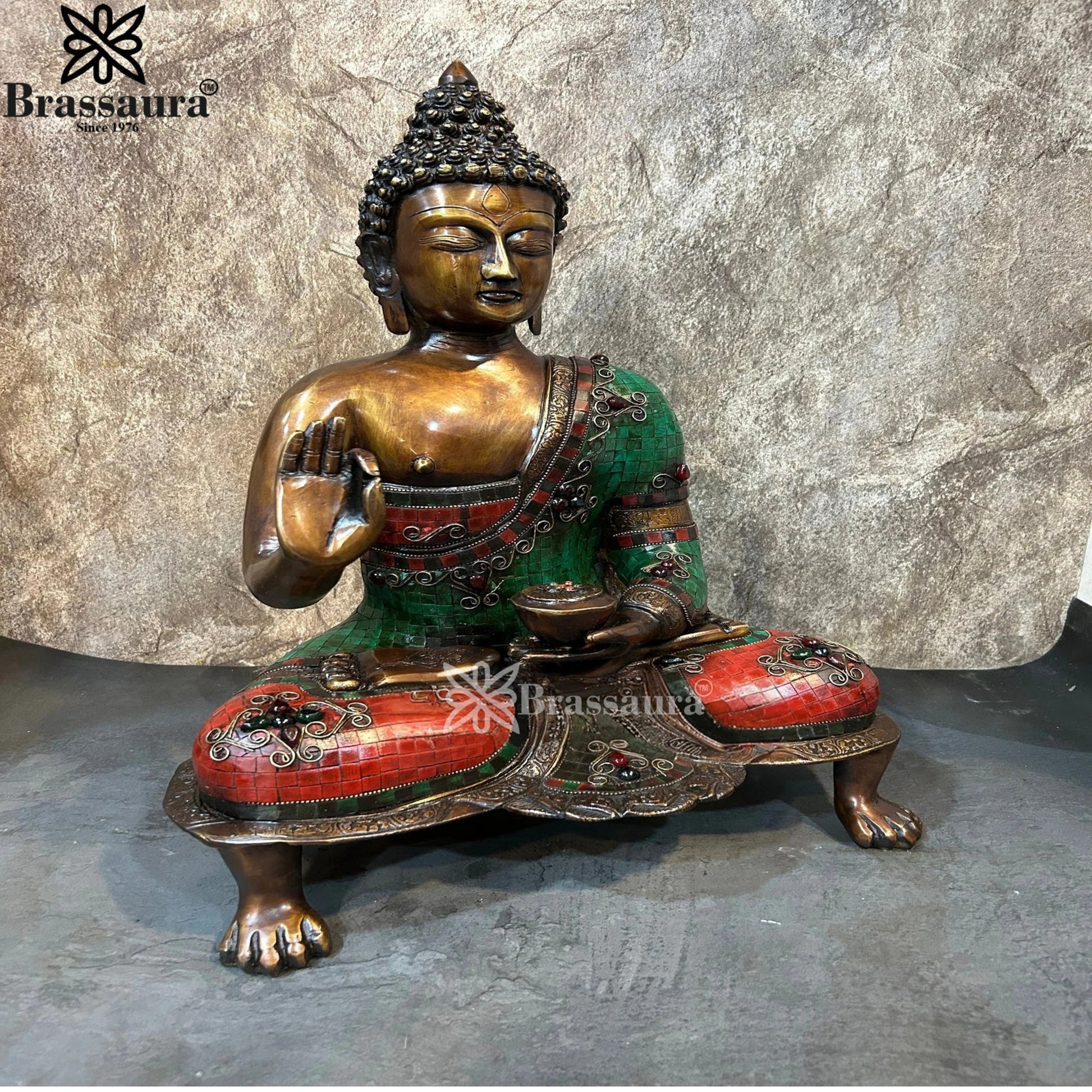 This Brass Blessing Gem Stone Work Buddha stands 20 Inch tall and weighs 11.8 kg, expertly crafted from solid brass and adorned with vibrant multicolored gemstone inlay. Depicted in the Abhaya Mudra—the gesture of blessing and fearlessness—this statue embodies protection, peace, and spiritual strength.