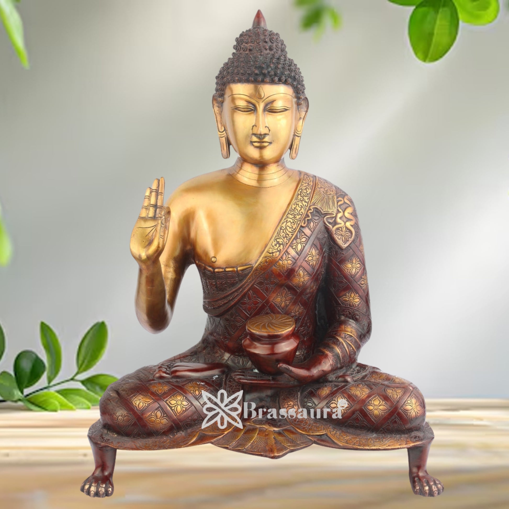 Majestic and serene, this Brass Blessing Buddha is a powerful symbol of protection, peace, and spiritual grace. Standing 26 Inch tall and weighing 22 kg, the statue is expertly handcrafted from solid brass, featuring detailed artistry and a calm, compassionate expression.