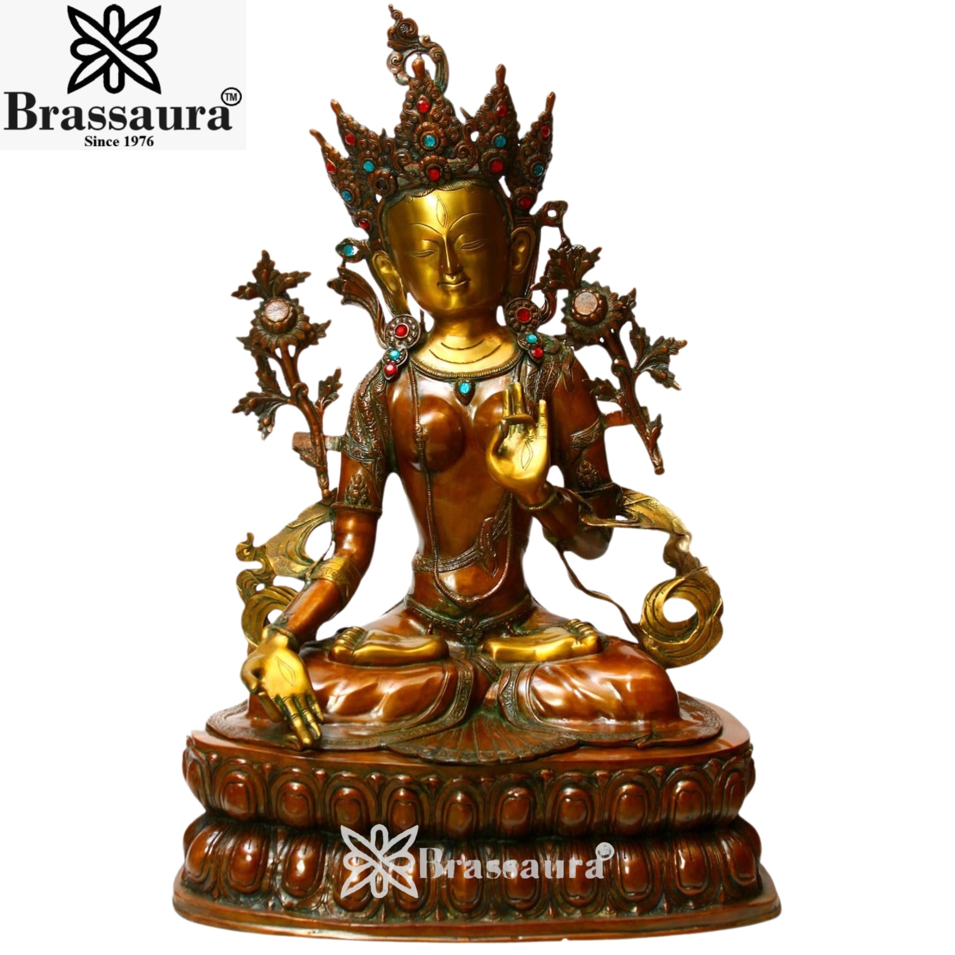 Commanding both reverence and beauty, this Brass Classic Tara statue embodies the divine spirit of the goddess in her most graceful and powerful form. Standing 34 inches tall and weighing 34 kg, this handcrafted piece is made from solid brass and features exquisite detailing that reflects timeless tradition and spiritual depth. The smooth, classic brass finish enhances its divine presence, making it a striking centerpiece for temples, meditation halls, or curated spiritual interiors.