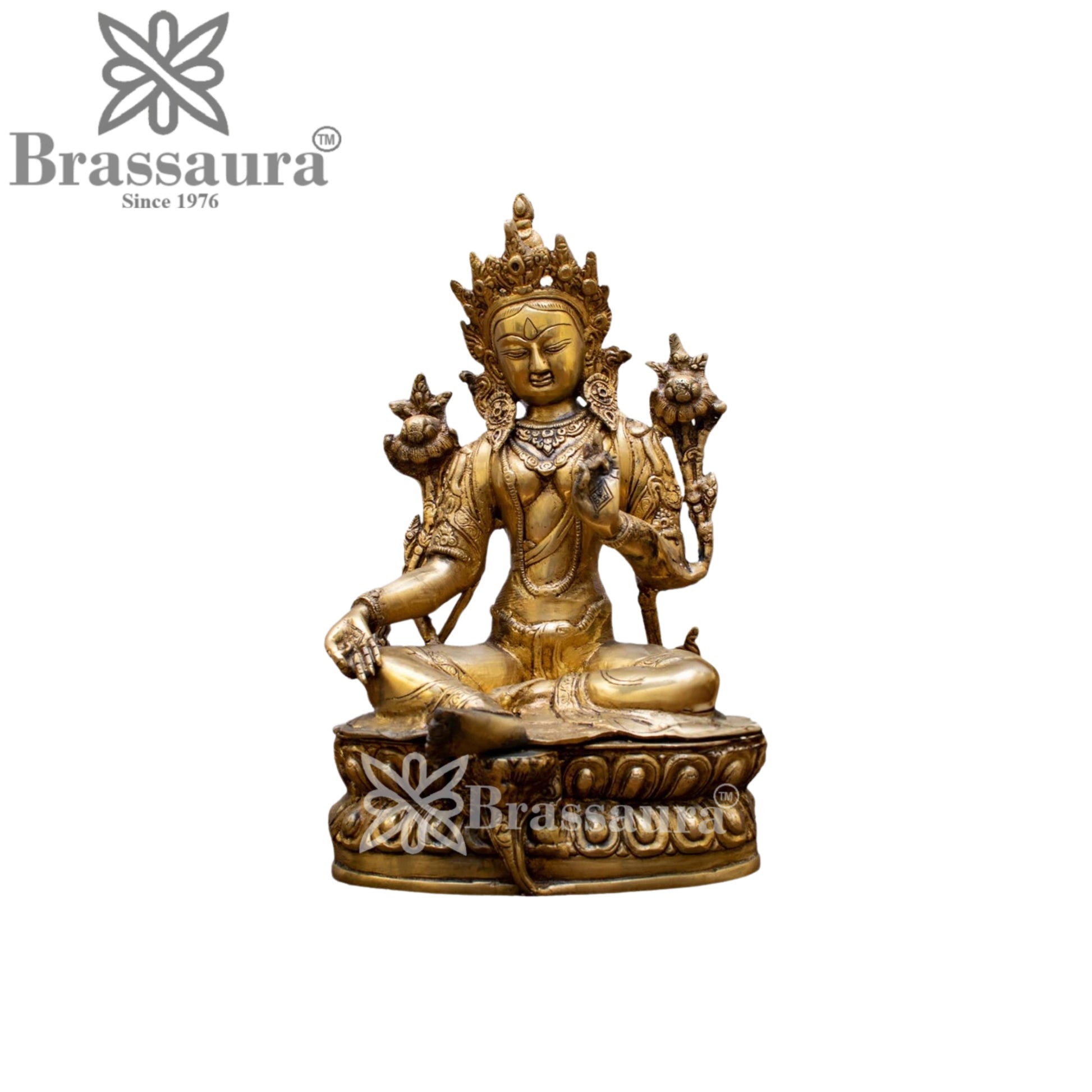 Delicately crafted yet radiating divine strength, this Brass Classic Tara statue stands 14 inches tall and weighs 4 kg. Made from solid brass and finished with a smooth, traditional polish, it captures the poised grace and sacred presence of Goddess Tara.