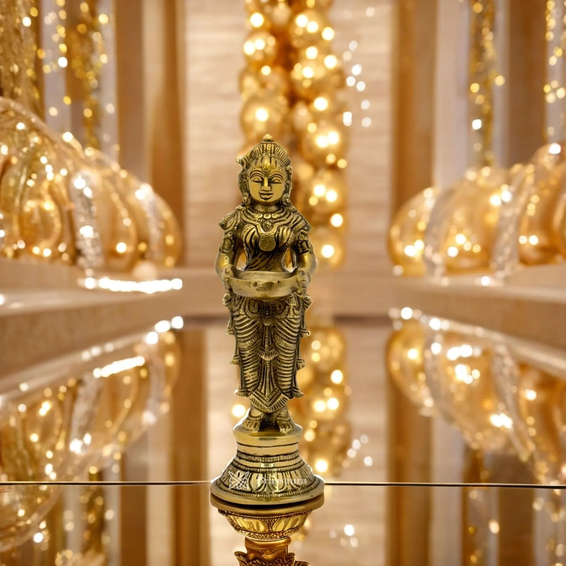 This beautifully crafted Brass Deep Lakshmi Idol brings together the spiritual power of Goddess Lakshmi and the illuminating glow of a deepak. With intricate detailing and a serene expression, this idol is perfect for pooja rooms, festive altars, or as a meaningful gift.