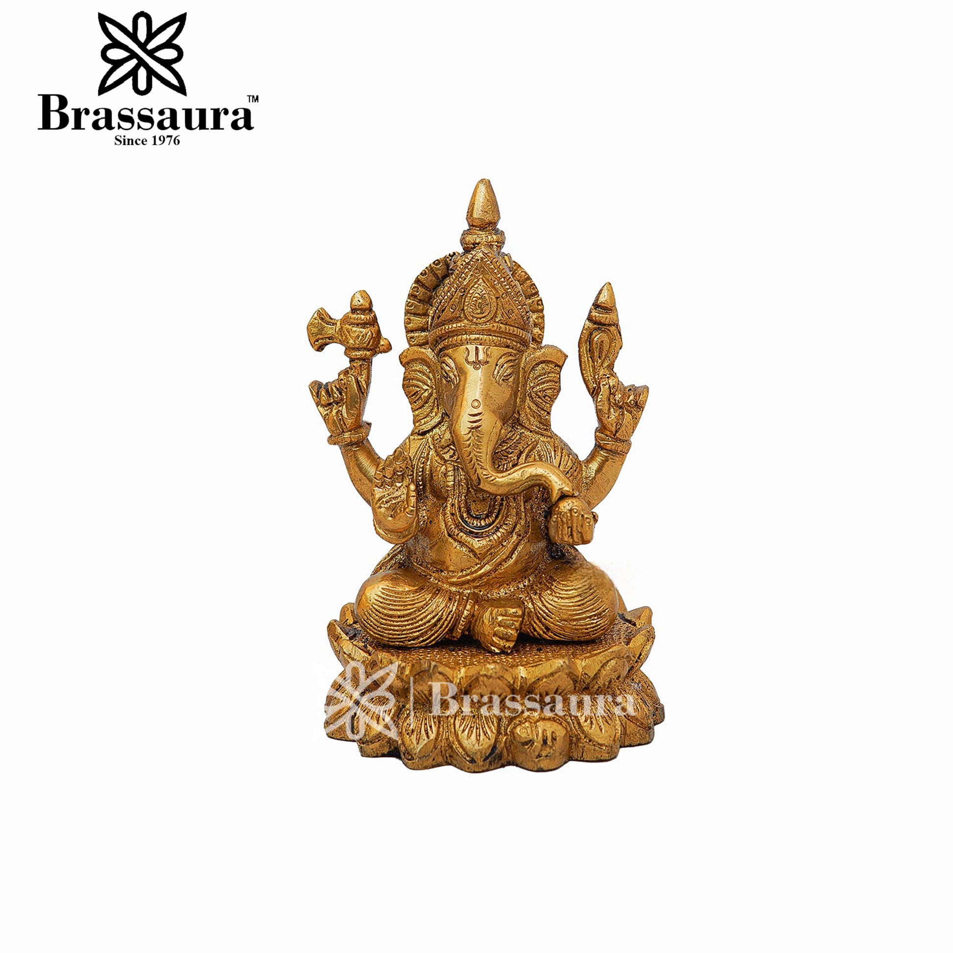 Brassaura™ Brass Lotus Ganesha Idol for Home and Decor | Weight 1.4 Kgs | Height 5.8 Inches