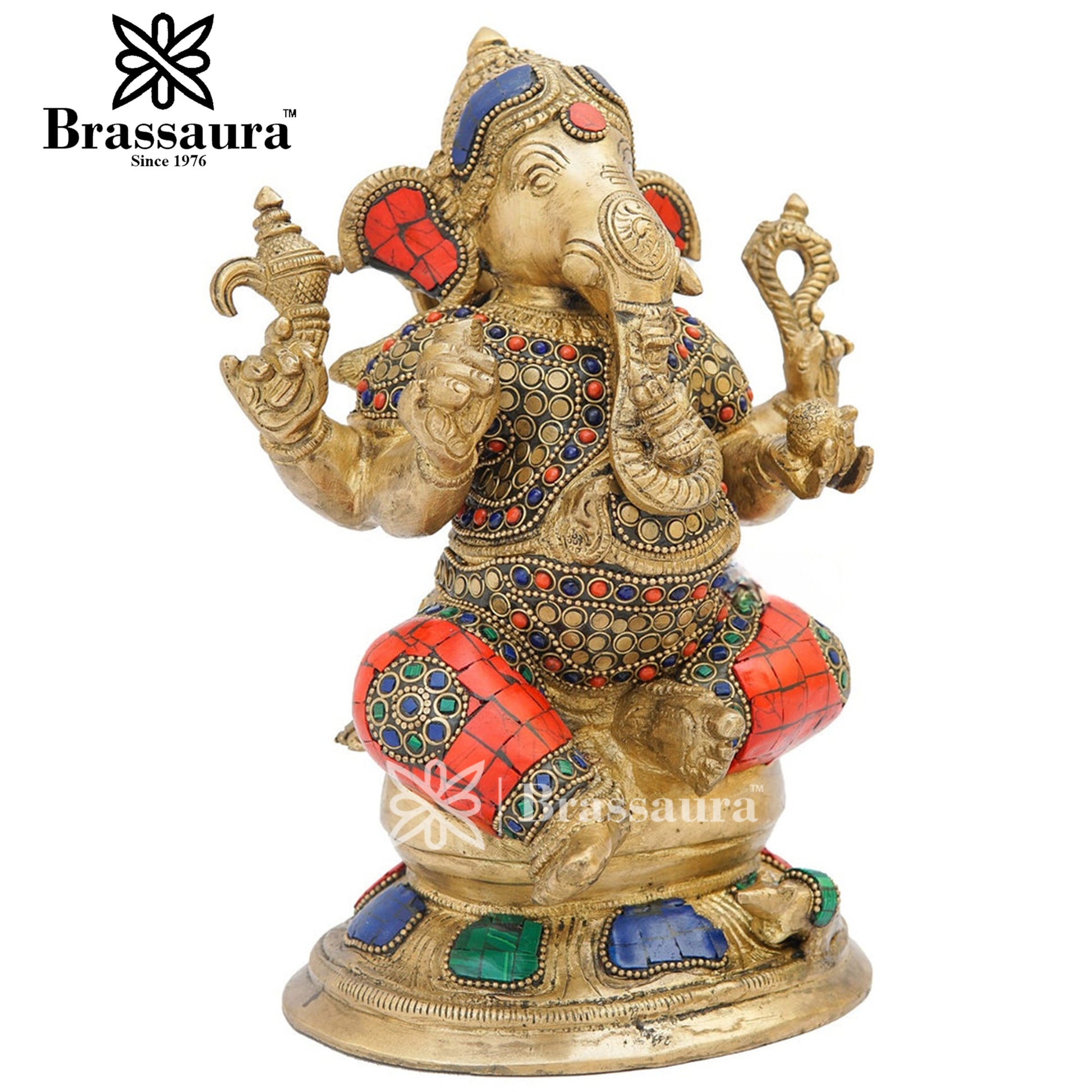 Brassaura™ Brass Gem Stone Work Ganesha Idol for Home and Decor | Weight 2.8 Kgs | Height 9 Inches