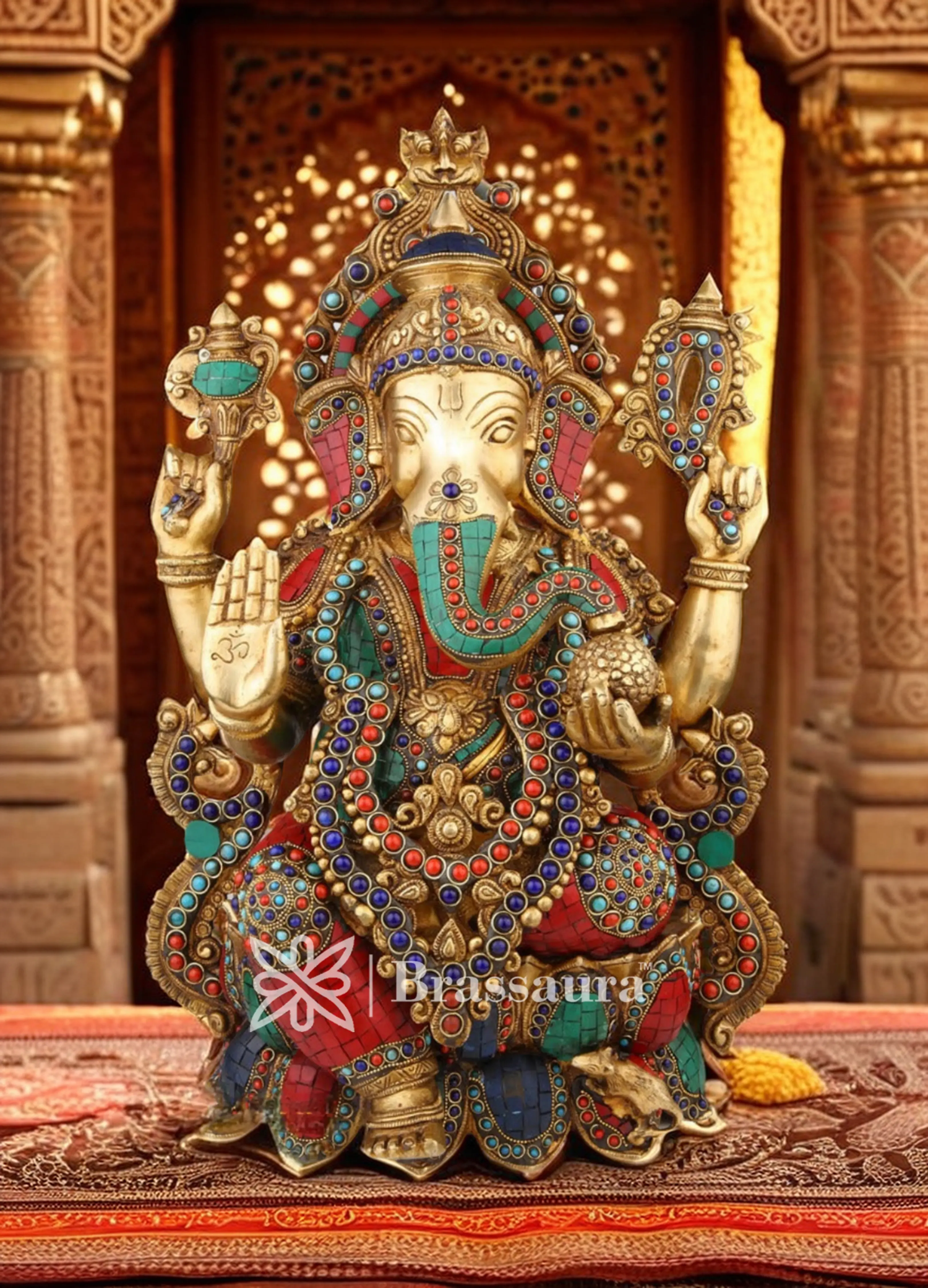 Brassaura™ Brass Big Size Gem Stone Work Jewellery Ganesha Idol for Home Décor | Weight 23 Kgs | Height 22 Inches
