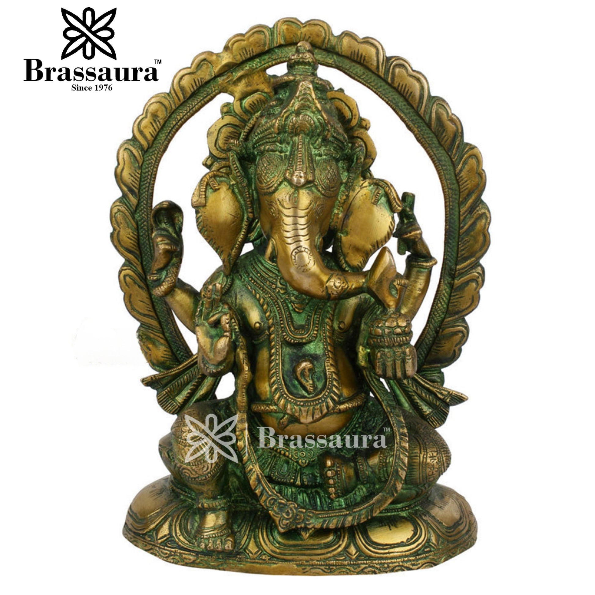 Expertly handcrafted from premium quality solid brass, this statue showcases intricate detailing, from Ganesha’s serene expression to the ornate ring that frames him. The green finish symbolizes renewal and harmony, making it an ideal addition to home temples, living rooms, offices, or meditation spaces.