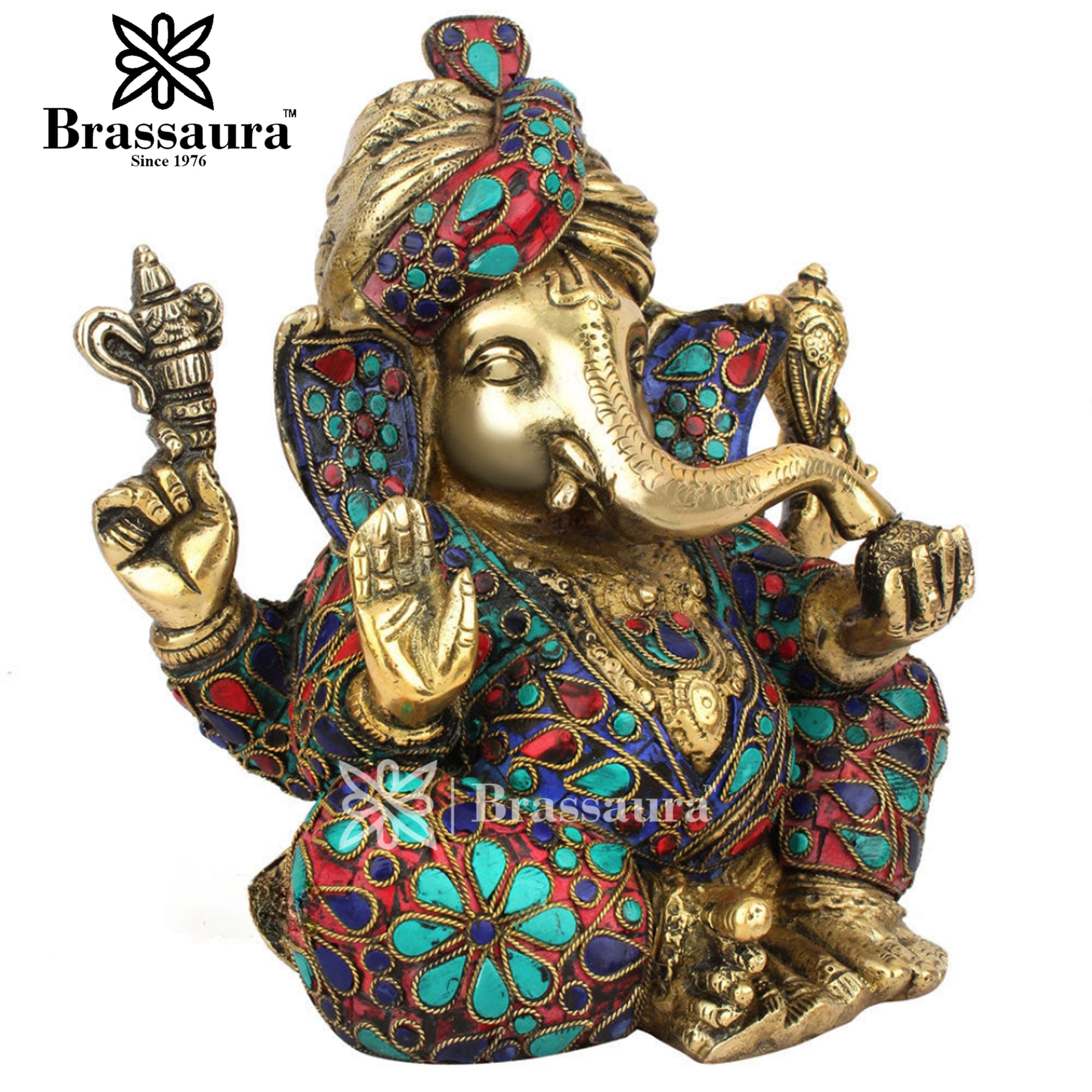 Brass Gemstone Work Ganesha Statue for Home Decor & Gift Item