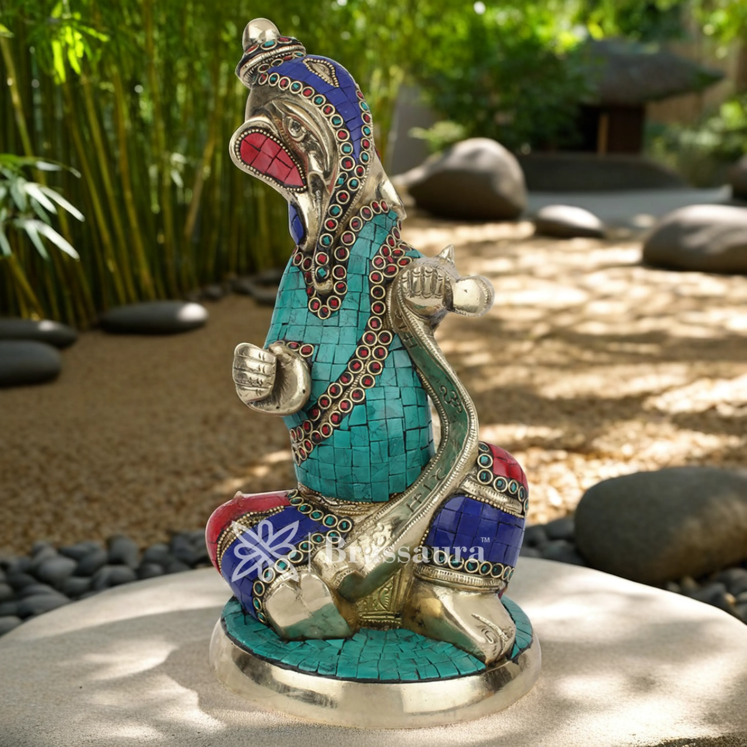 Made from premium solid brass, the statue features intricate gemstone inlay work, adding vibrant color and elegance to its sleek, modern form. Lord Ganesha, revered as the remover of obstacles and harbinger of wisdom and prosperity, is depicted in a contemporary style, ideal for home decor, offices, temples, or meditation areas.