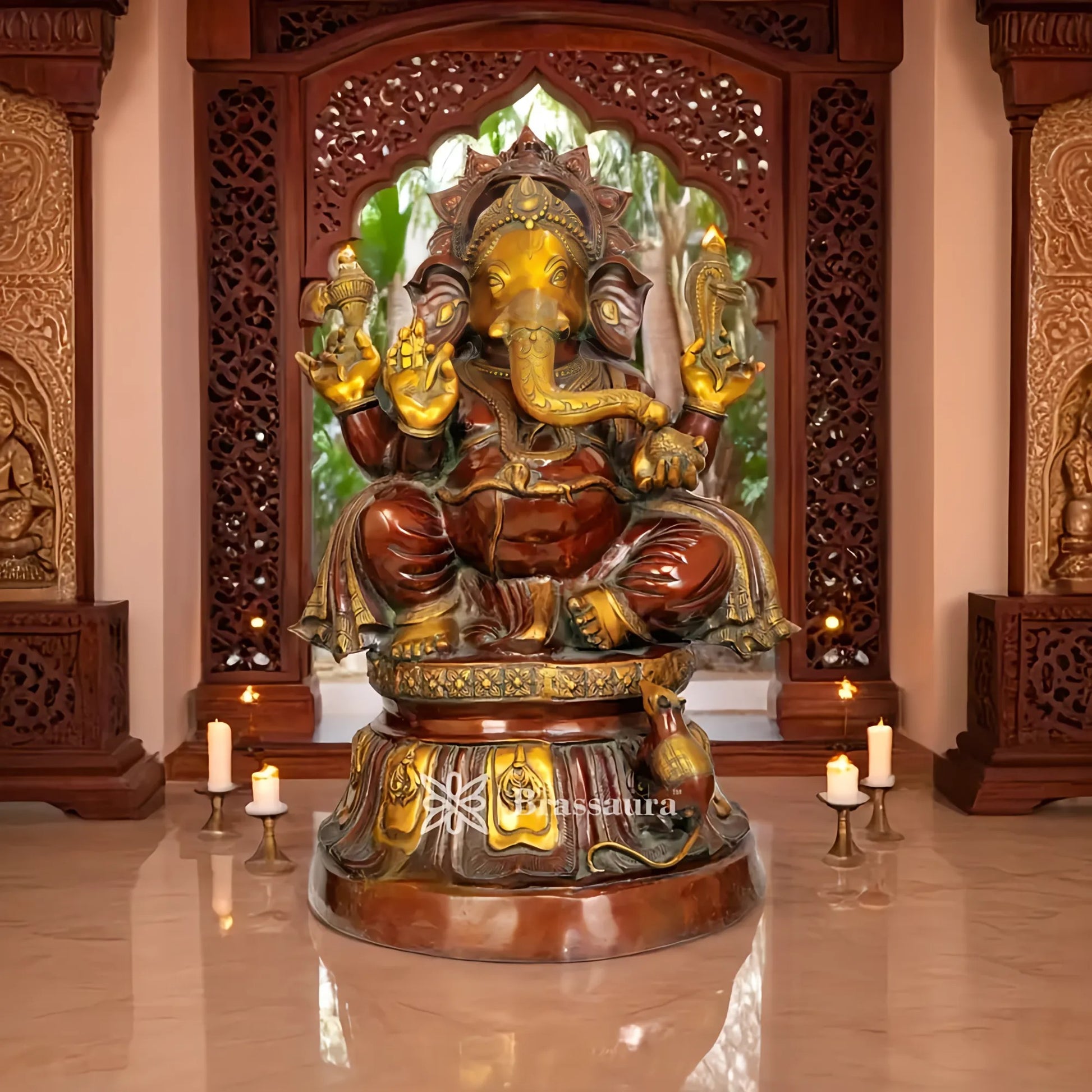 This grand handcrafted brass Ganesha statue radiates divine energy and auspicious charm. Featuring intricate carvings and a polished antique finish, the idol symbolizes wisdom, prosperity, and the removal of obstacles. Perfect as a centerpiece for home temples, large pooja halls, or as a premium gift, it brings spiritual elegance and commanding presence to any space.