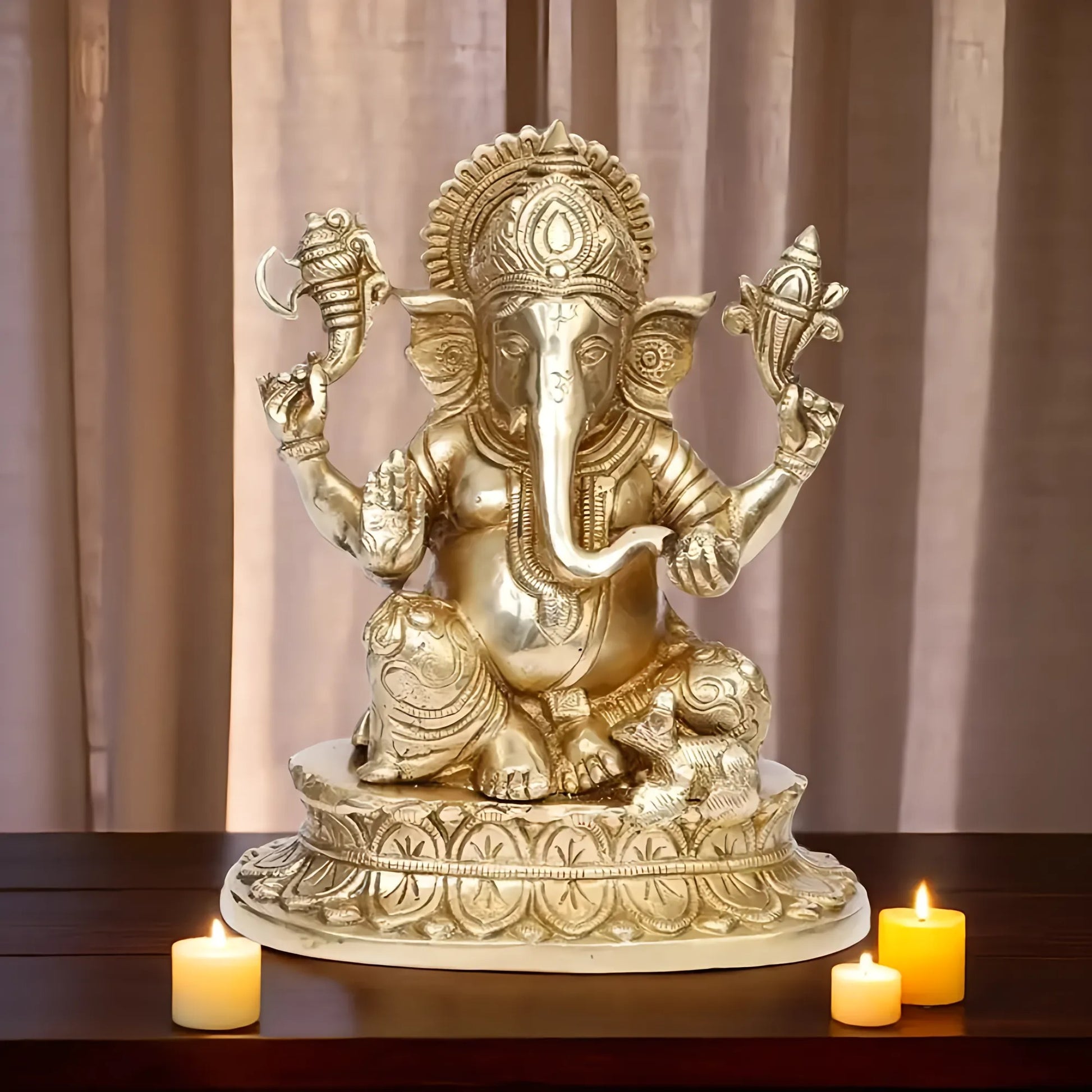 This finely handcrafted brass Ganesha Murti features exquisite detailing and a polished antique finish. Perfect for home temples, entrance décor, or gifting, it brings divine blessings, positivity, and auspicious energy to your surroundings.