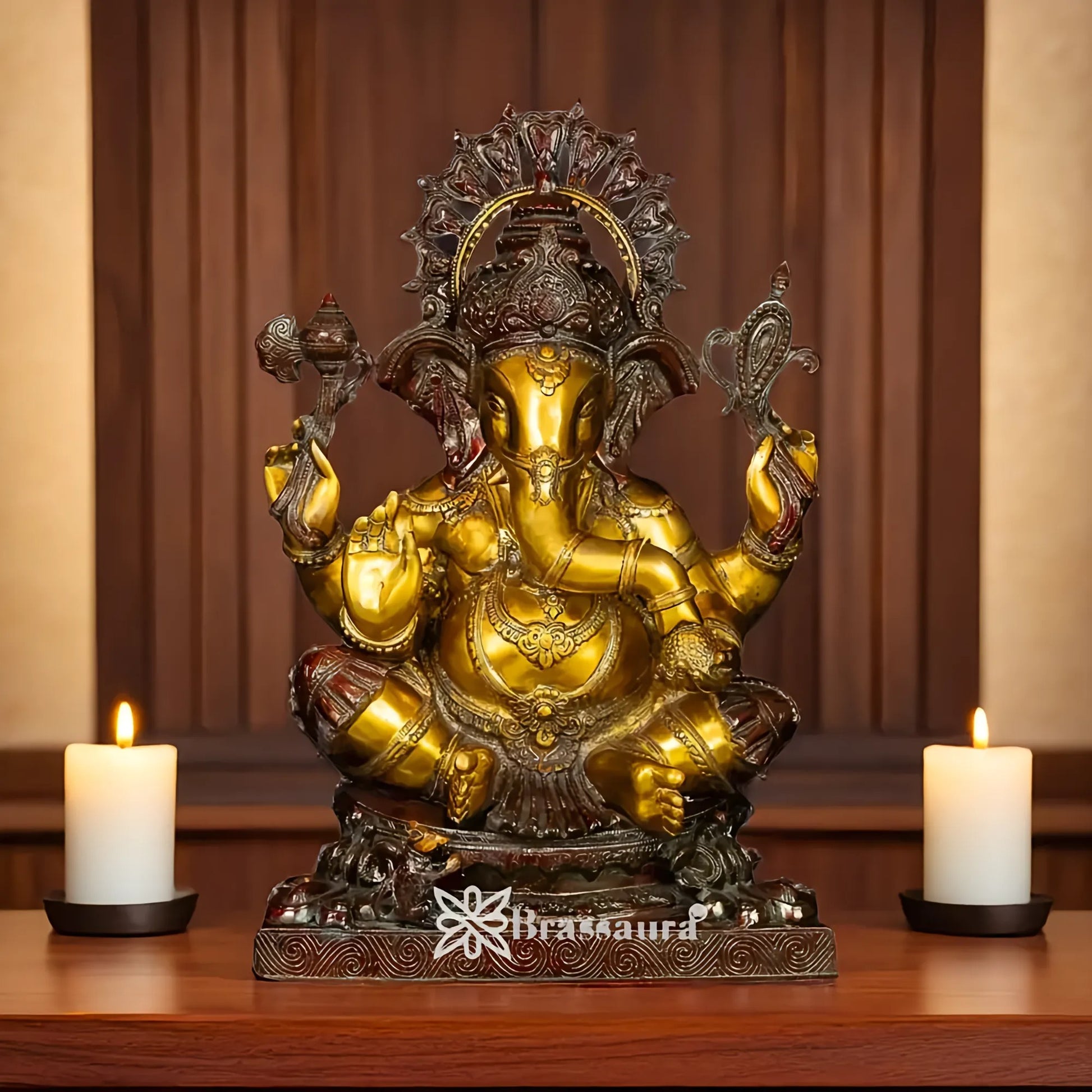 Masterfully crafted in solid brass, this grand Ganesha idol reflects divine artistry and intricate craftsmanship. The fine detailing and elegant proportions make it a magnificent addition to temples, pooja rooms, or living spaces, radiating auspiciousness and grace.