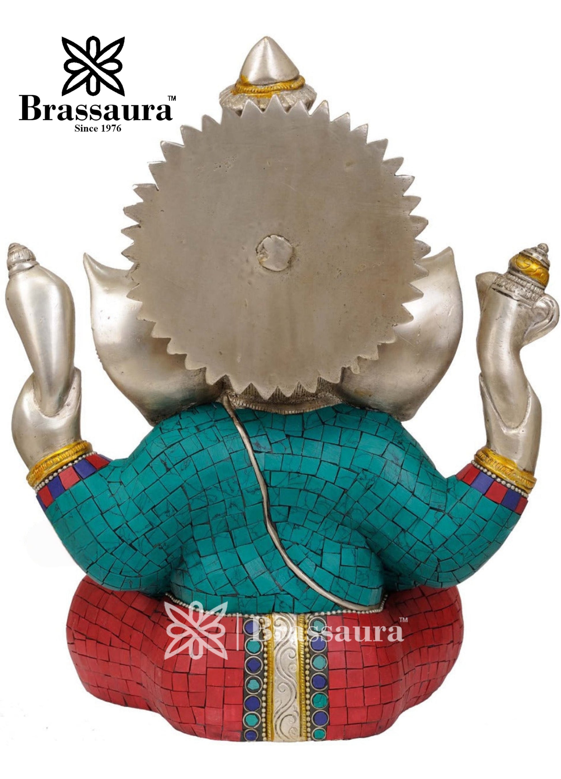 Handcrafted from premium quality brass, this Ganesha idol features intricate detailing, from the finely carved ornaments to the carefully embedded gemstones, enhancing its aesthetic beauty and spiritual significance. The combination of brass and gemstone inlay work makes it a striking centerpiece for home decor, temples, or office spaces.