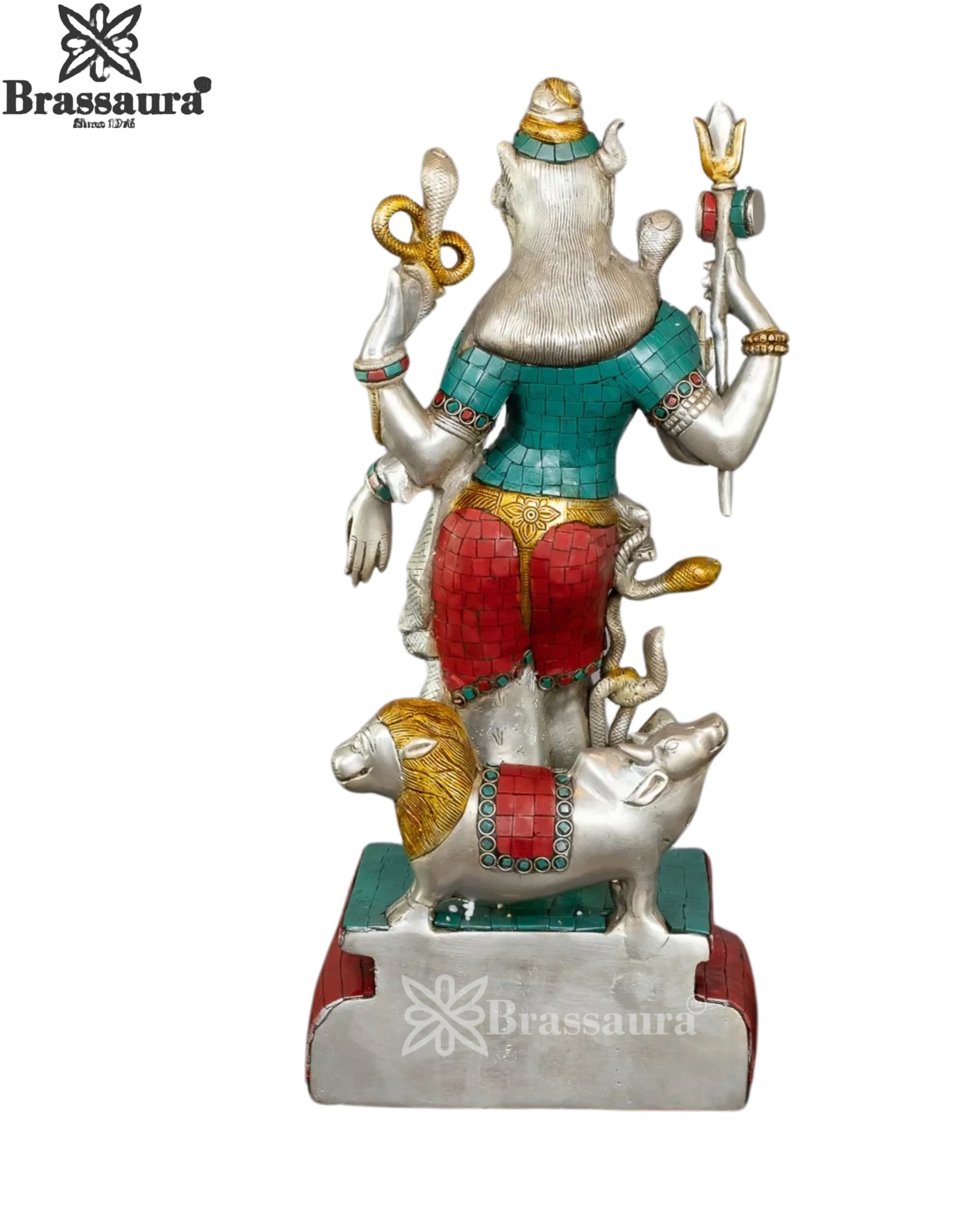 Graceful and divinely symbolic, this Brass Gemstone Work Ardhanarishwar Statue stands 19 inches tall and weighs 10 kg. Meticulously handcrafted from solid brass and adorned with intricate gemstone inlay, the statue beautifully represents the sacred union of Lord Shiva and Goddess Parvati, symbolizing perfect balance between masculine and feminine energies.