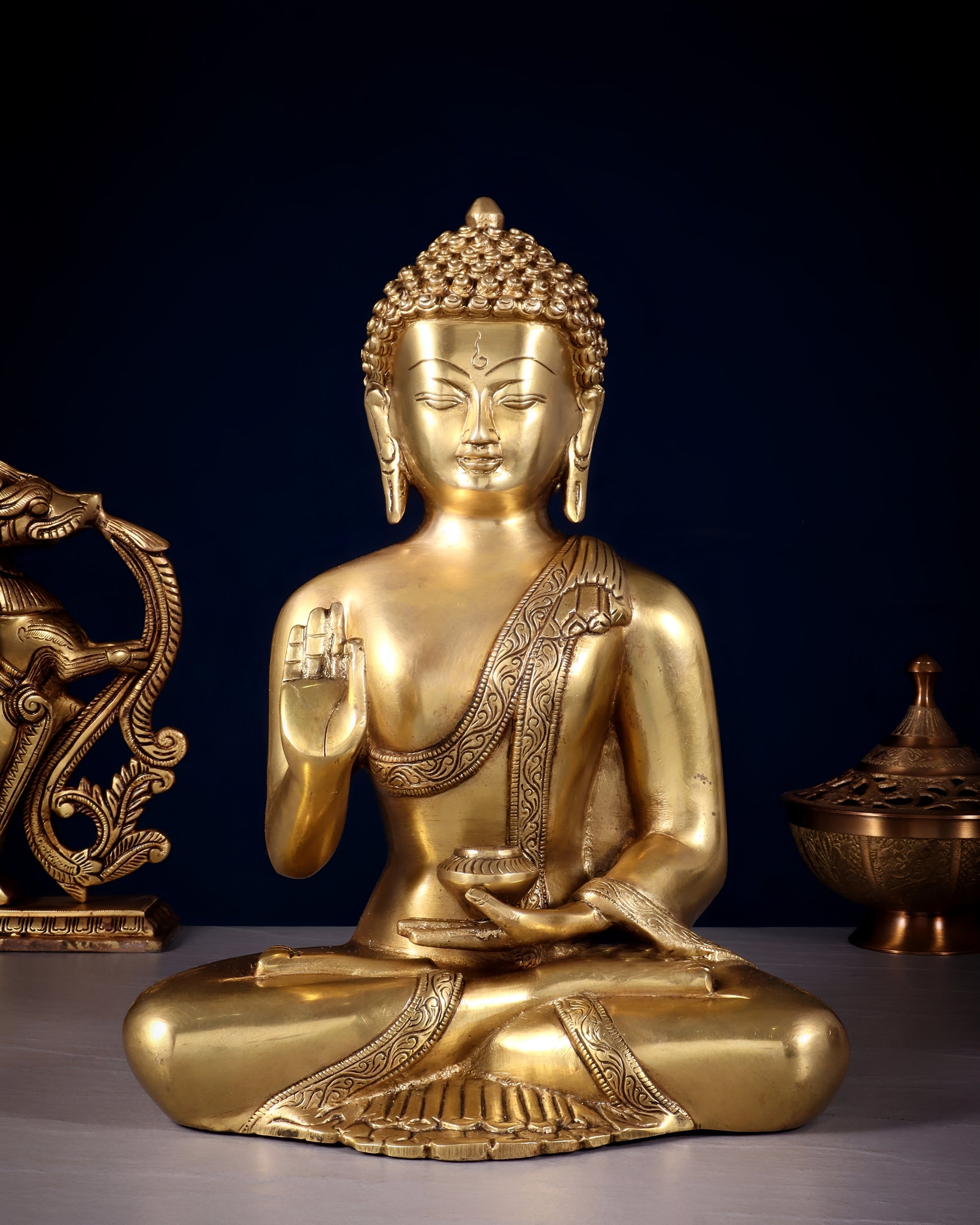 Radiating compassion and benevolence, this Blessing Buddha statue stands 12 inches tall and weighs 5.5 kg. Crafted from solid brass and beautifully accented with gemstone inlay, it depicts the Buddha in the Blessing Mudra — a gesture symbolizing generosity, protection, and spiritual grace.