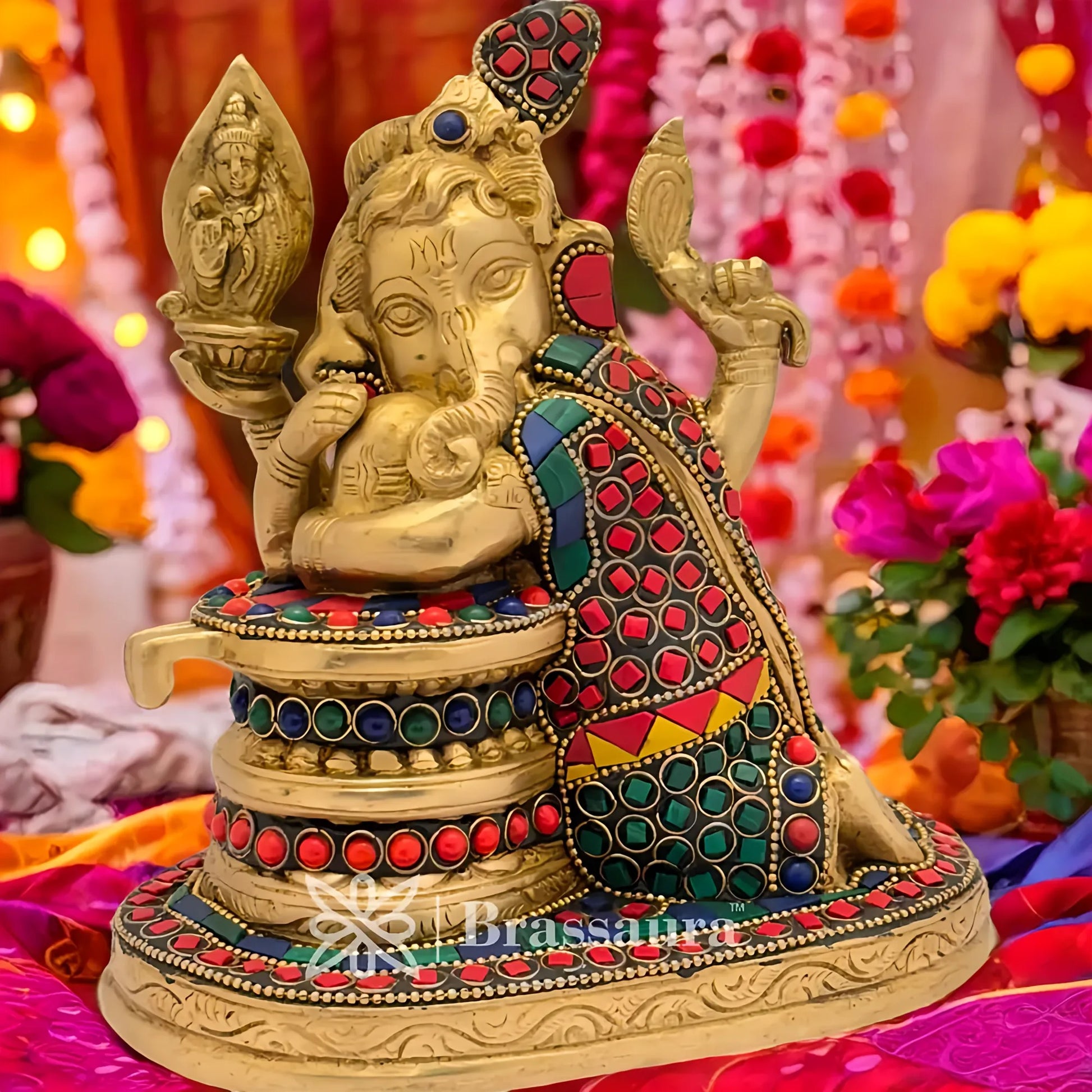 Brassaura™ Brass Gem Stone Work Ganesha with Shivling Idol for Home and Decor | Weight 1.9 Kgs | Height 6.30 Inches