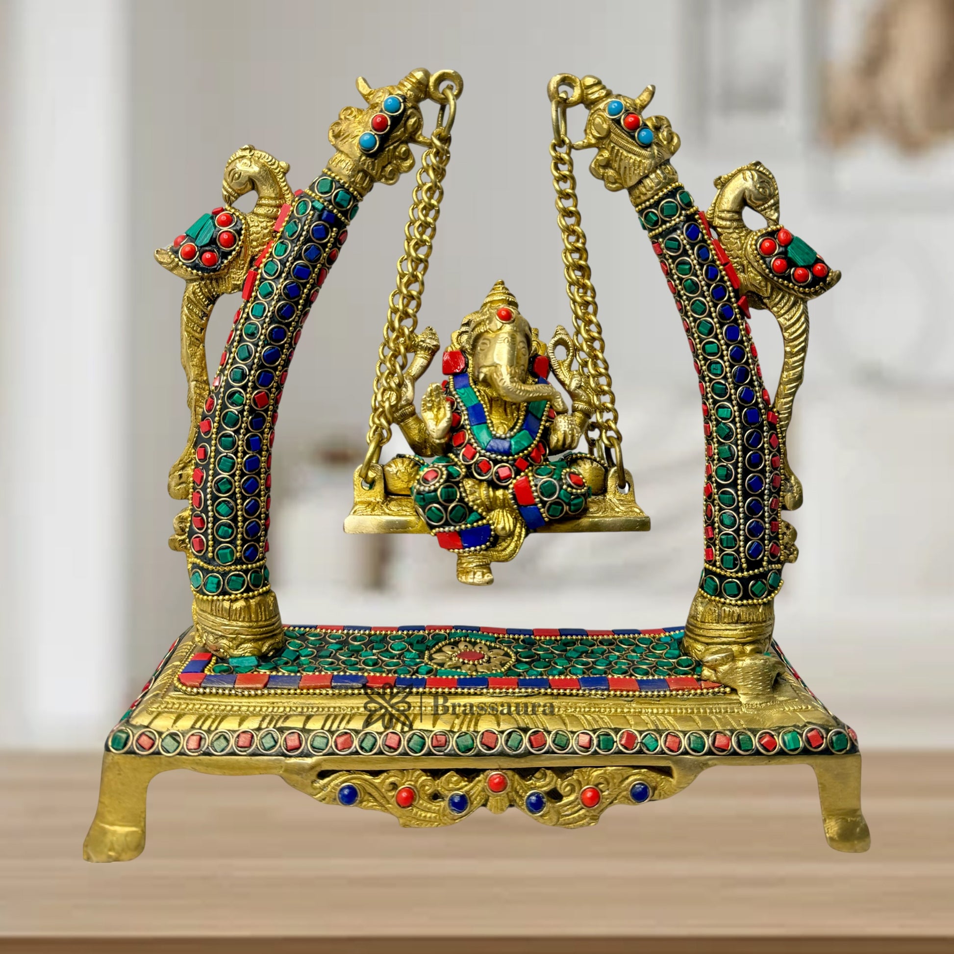 Brass Gemstone Work Ganesha Jhula Statue for Home Decor