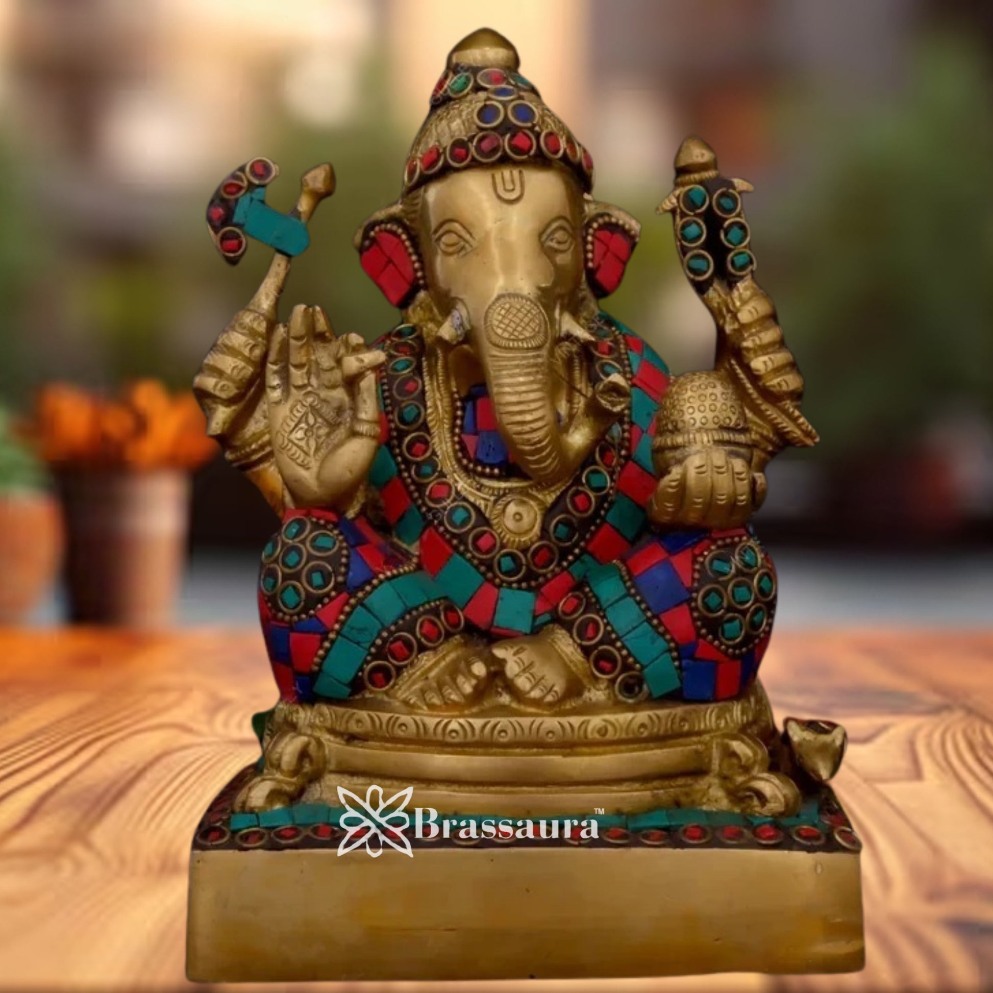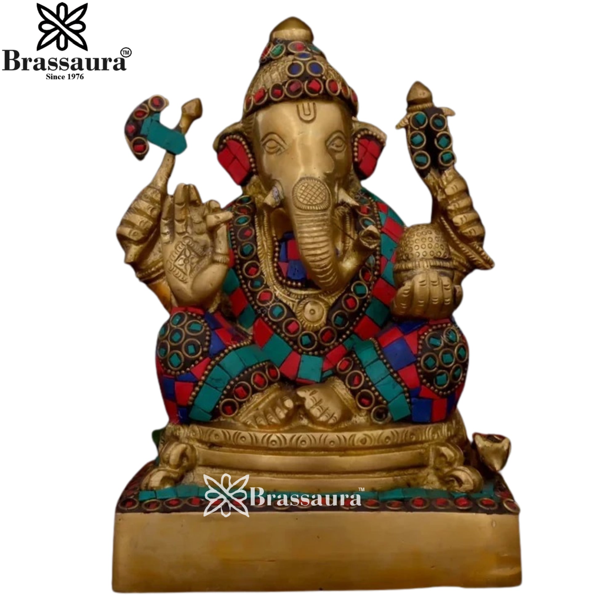 Standing 6.6 inches tall and weighing 2.65 kg, this beautifully handcrafted piece features Lord Ganesha adorned with vibrant inlaid gemstones that add elegance and spiritual energy. Made from premium solid brass, it's ideal for compact altars, gifting, or as a vibrant spiritual accent in any space.