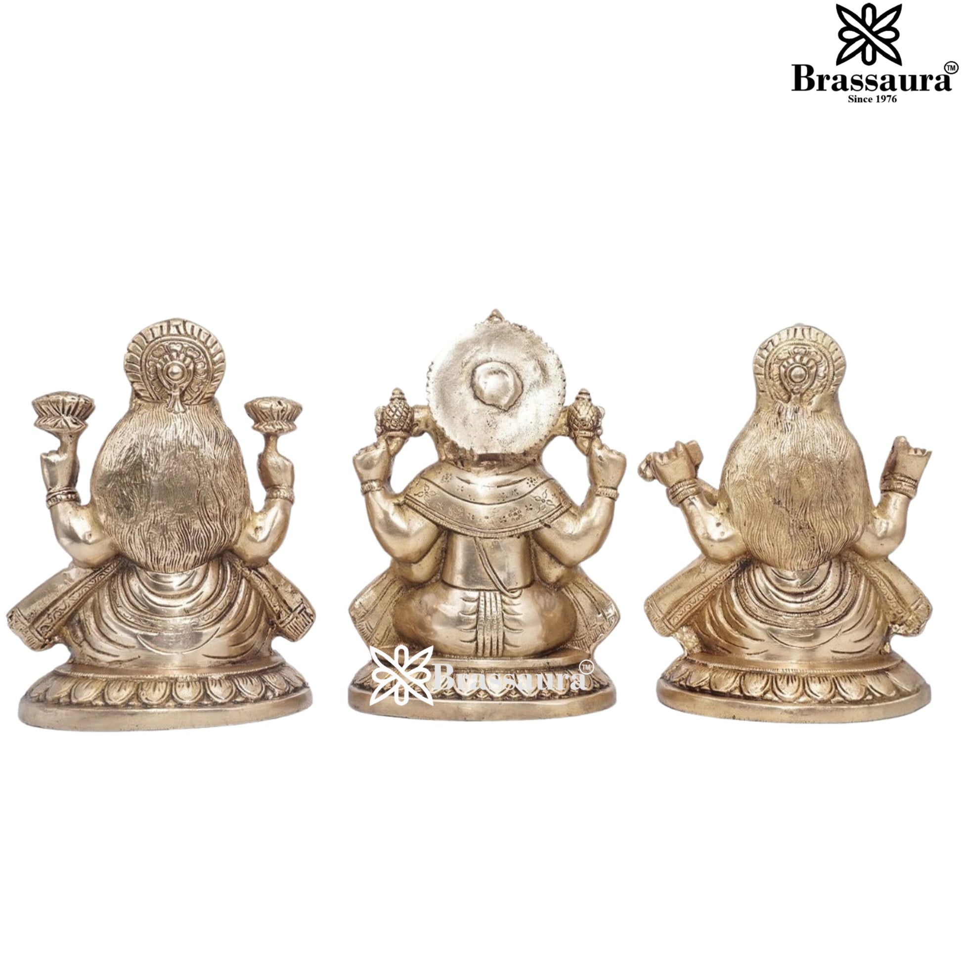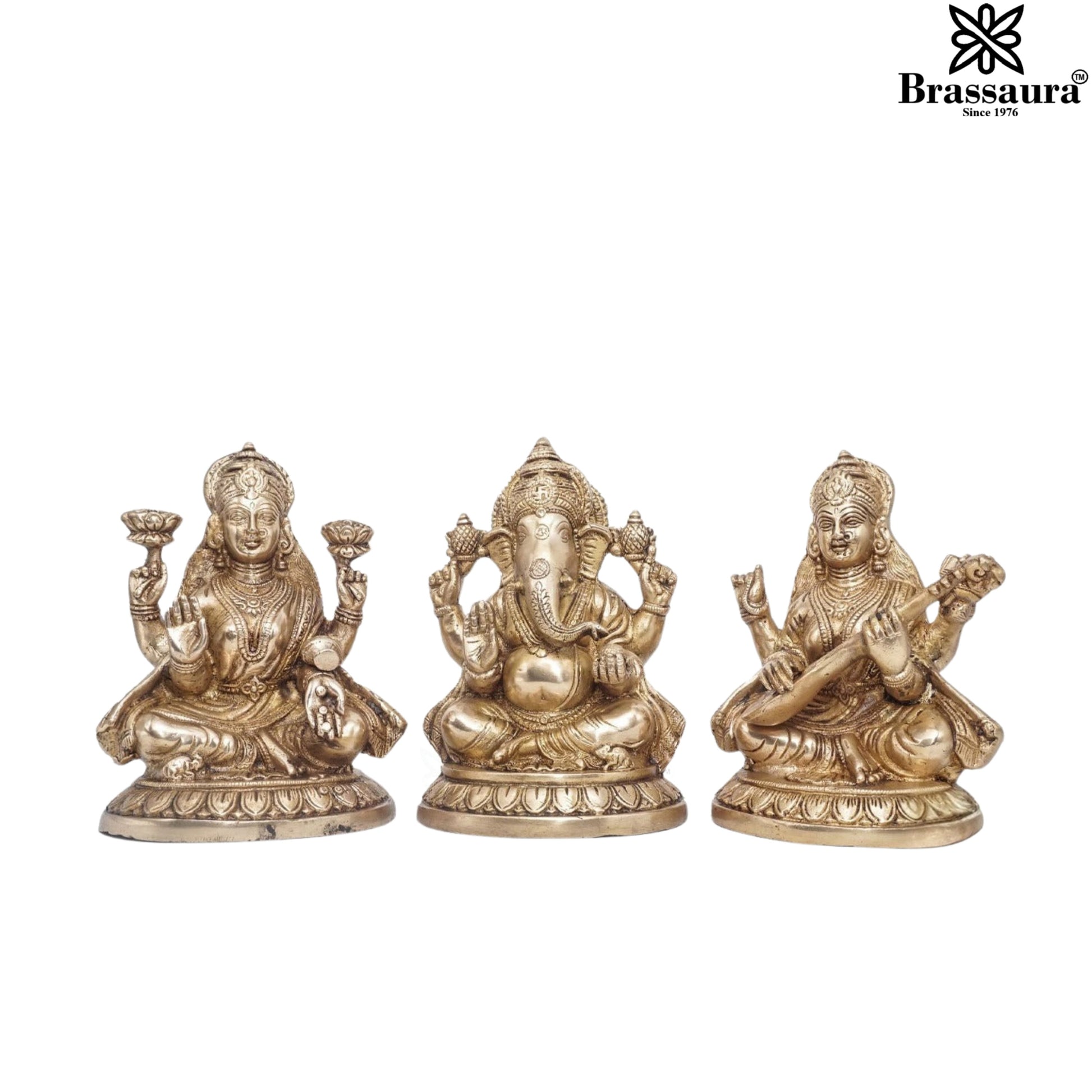 Brassaura™ Elegant Brass Antique Laxmi Ganesha Saraswati Statue – Height 7.5" & Weight 9 Kgs | Temple Décor