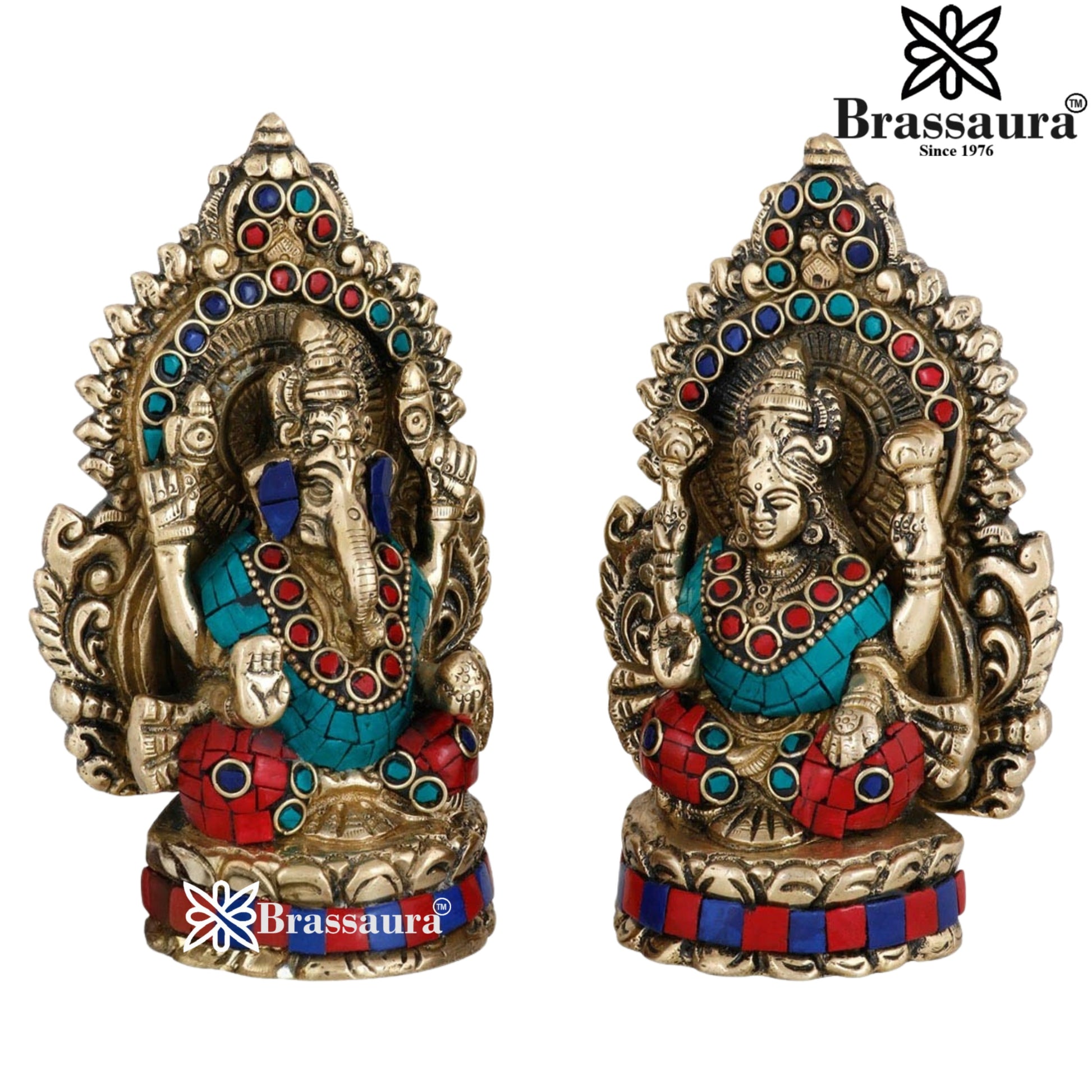 Brassaura™ Brass Gem Stone Work Laxmi Ganesha Idol – Height 5.5 Inches & Weight 1.8 Kgs | Hindu God Statue
