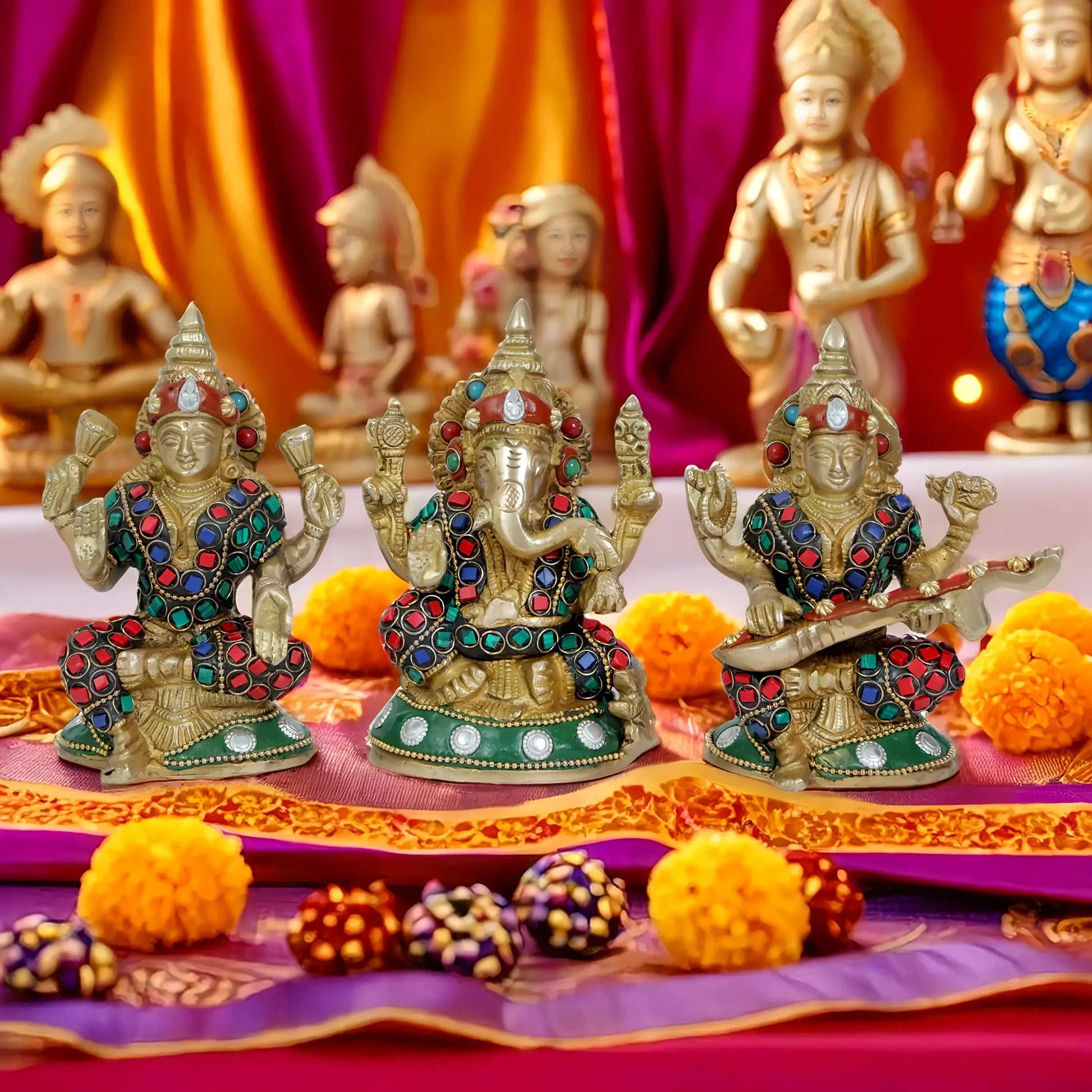 A beautifully handcrafted Premium Brass Gemstone Laxmi Ganesha Saraswati Idol, designed with fine detailing and gemstone embellishments. This sacred trio embodies abundance, wisdom, and auspicious beginnings, making it a perfect addition to your puja room or gifting on divine occasions.