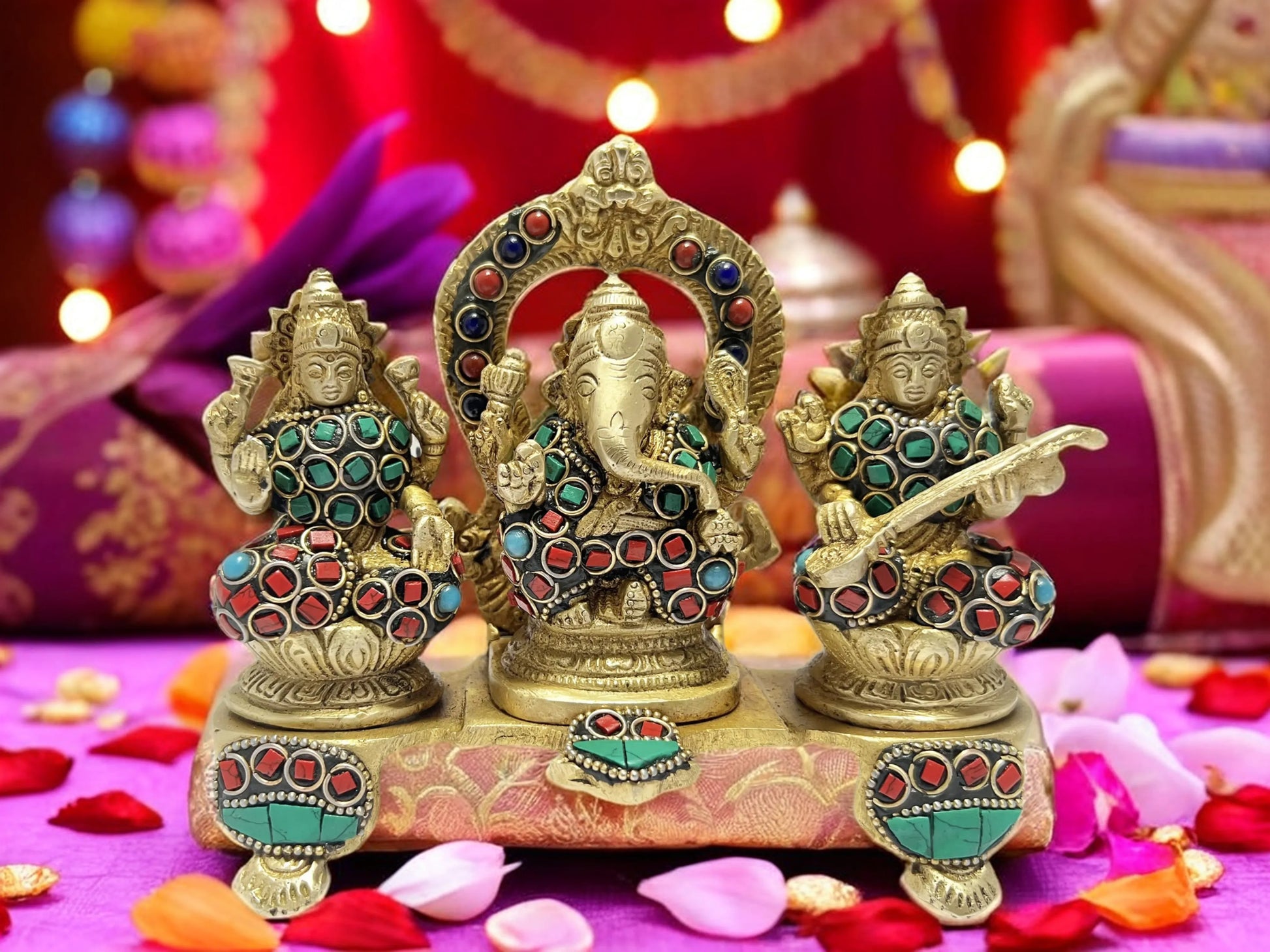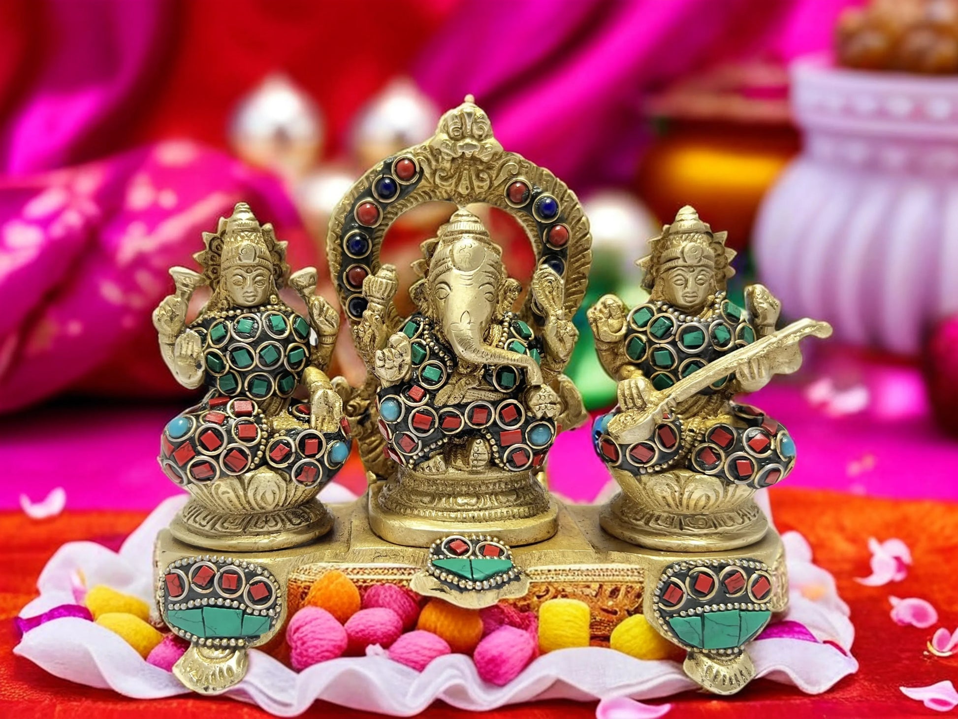 Brassaura™ Artistic Brass Gemstone Laxmi Ganesha Saraswati Statue – Height 7.6 Inches & Weight 1.35 Kgs | Puja Room Idol