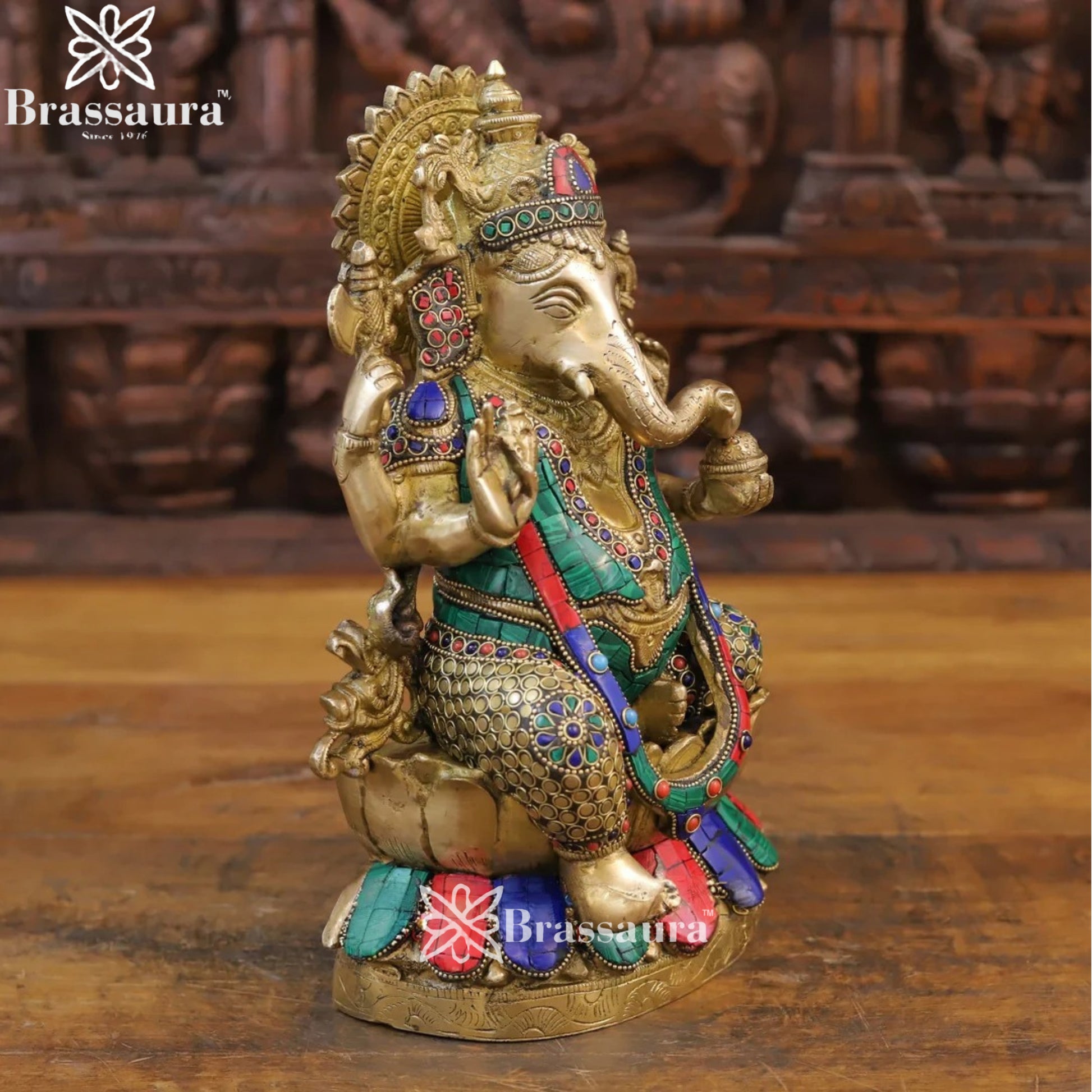 Brass Gem Stone Work Lotus Ganesha Weight 5.36 Kg & Height 12 Inch