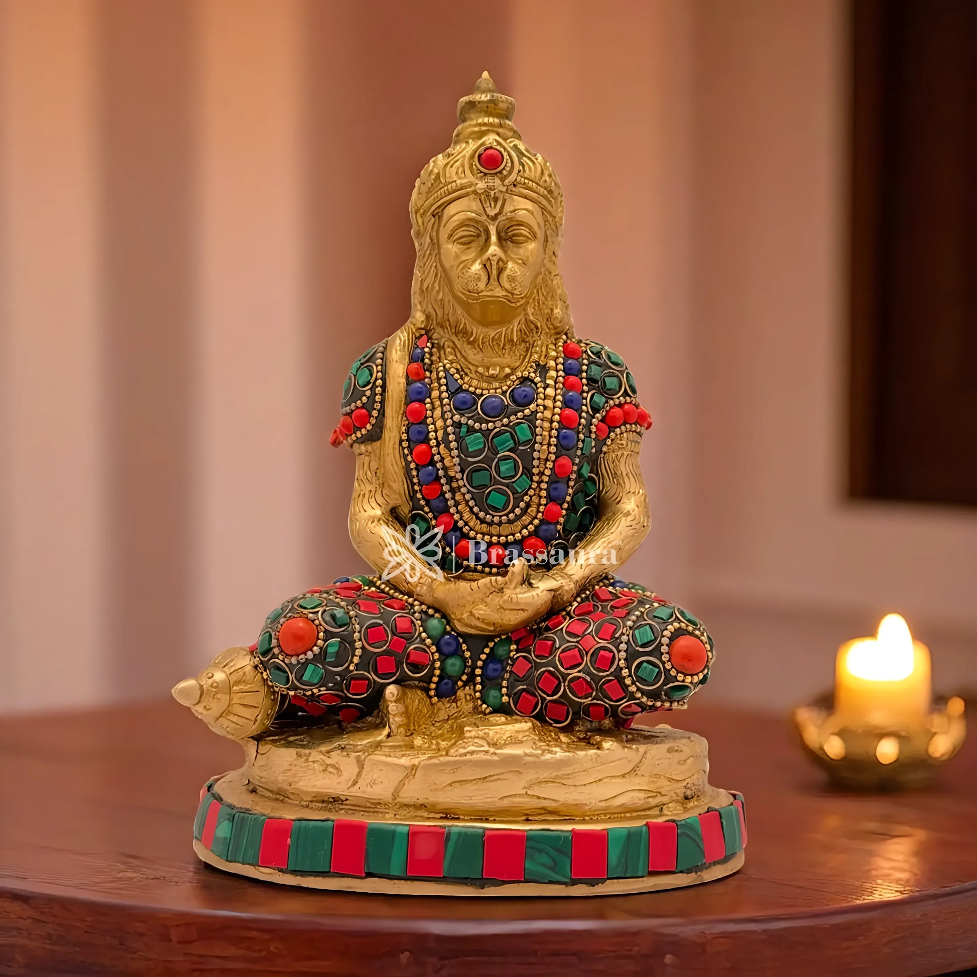 Brassaura™ Brass Gem Stone Work Meditation Hanuman Idol – 7.2 Inches, 1.8 Kgs | Home & Temple Décor